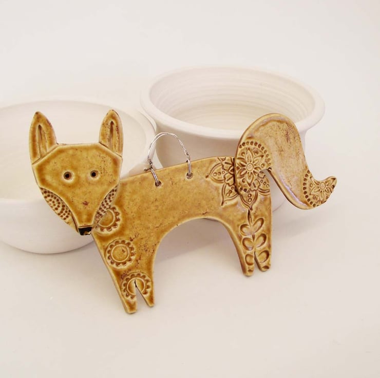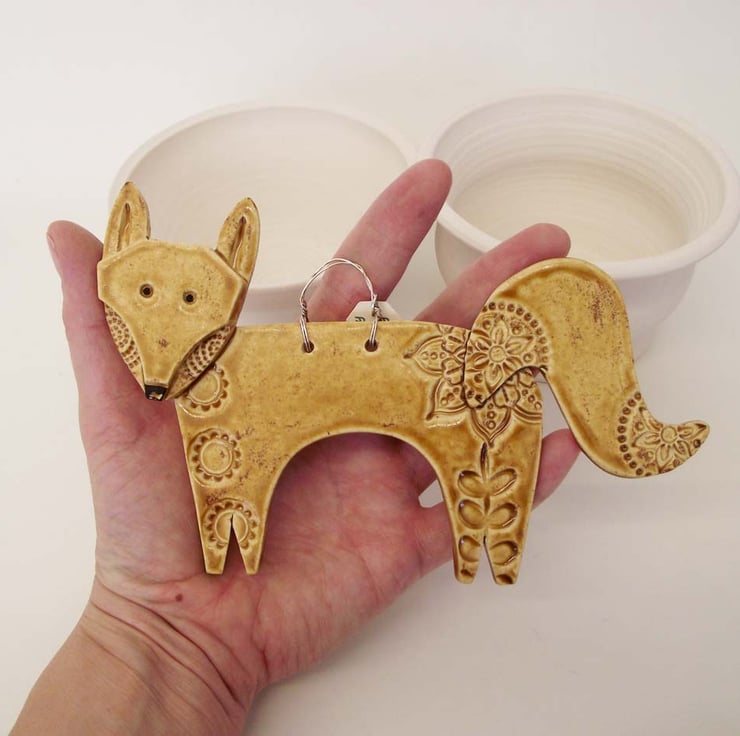 This cute little fox is made from white earthenware clay and decorated in a folk art style.
