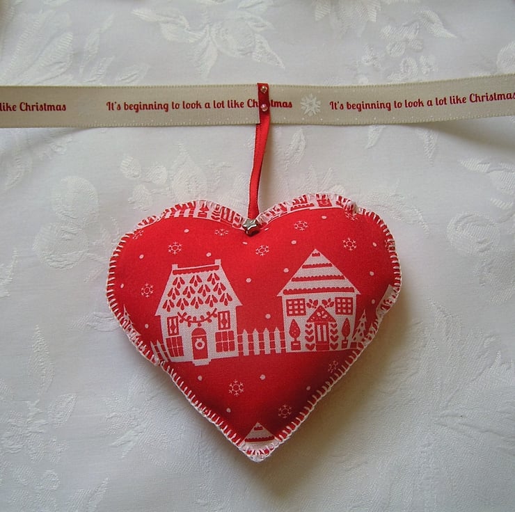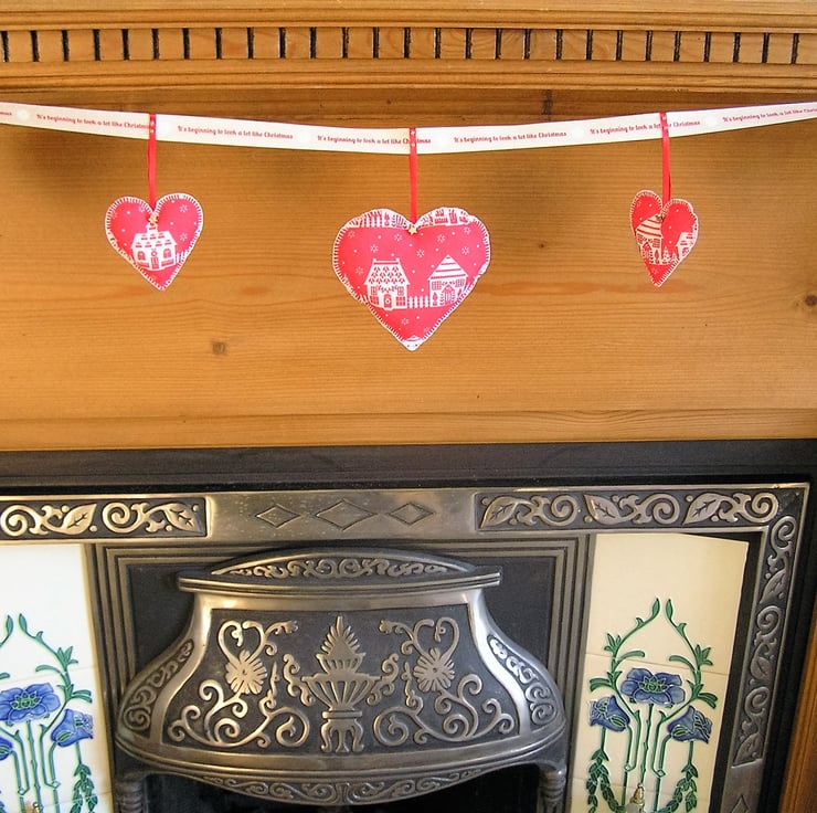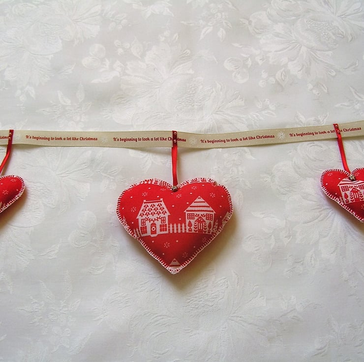 Red and white heart shaped Christmas bunting. There are 7 hearts in total, 3 large hearts and 4 small, all made in polyester cotton fabric with a Christmas cottage design. All hand stitched, edged in blanket stitch and filled with polyester toy filling.