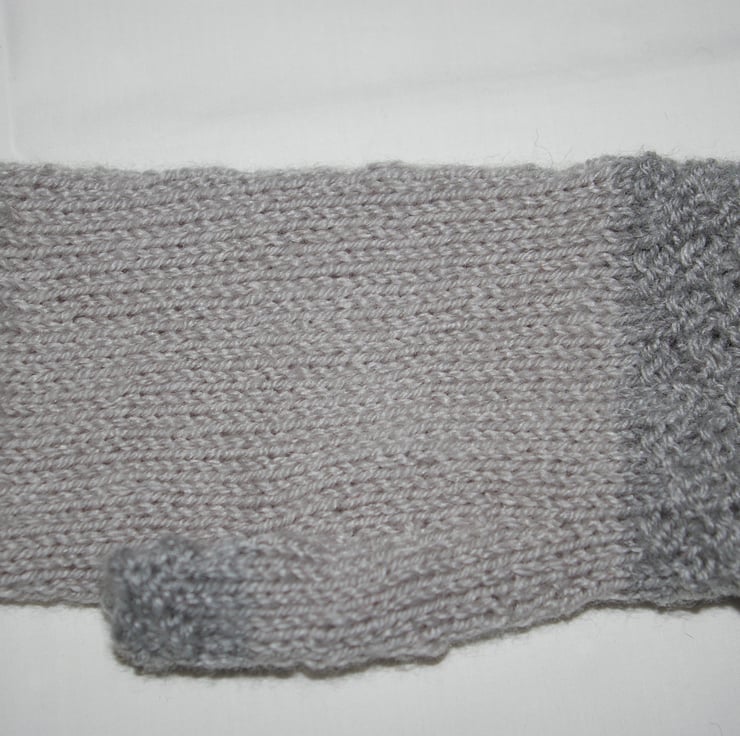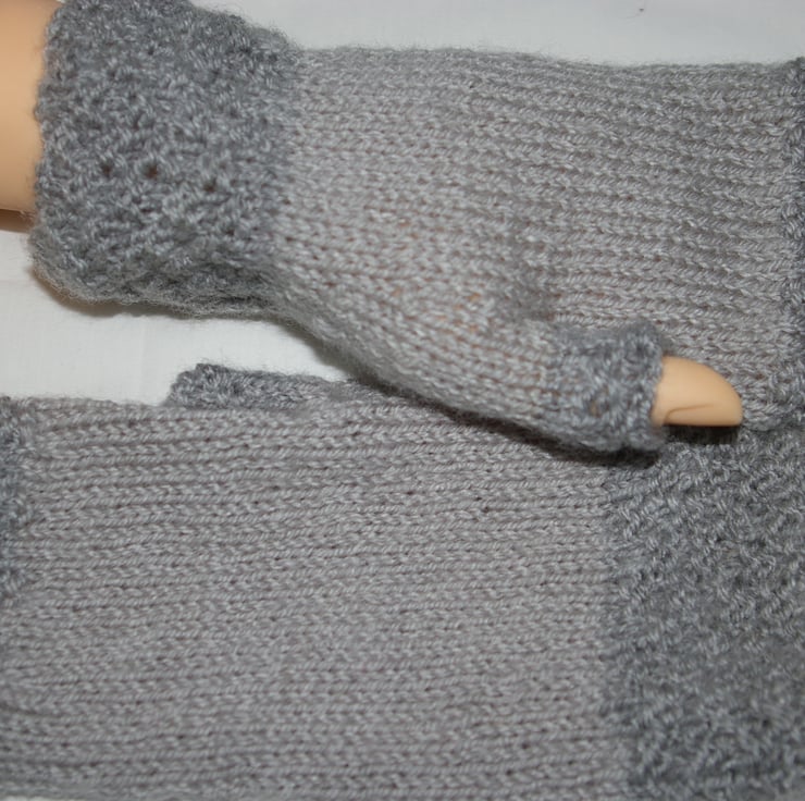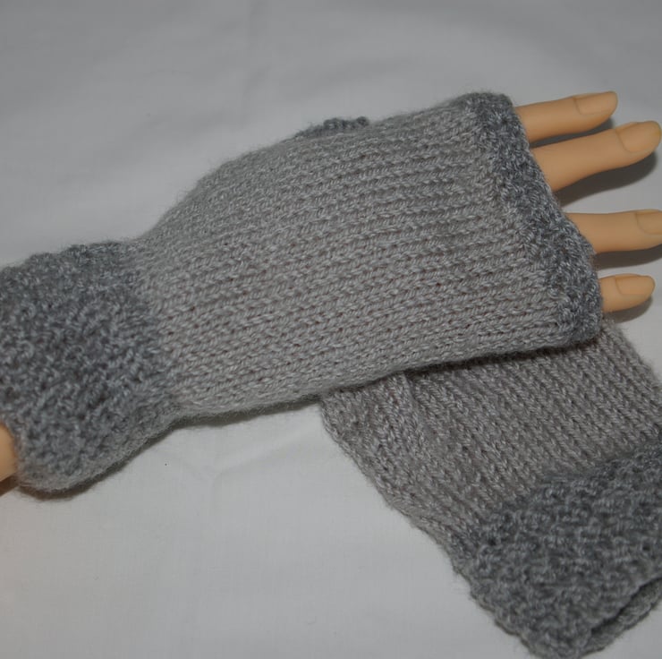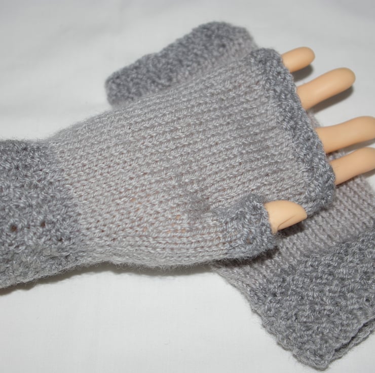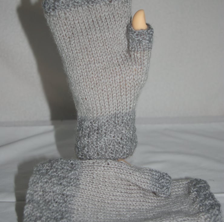 A stylish pair of adult fingerless gloves, lovingly hand knitted in two different tones of grey yarn. The cuff’s, thumbs and top rib have been knitted in a dark grey while the main body of the gloves have been knitted in a light grey. The gloves are knitted in the round so there is no side seam.