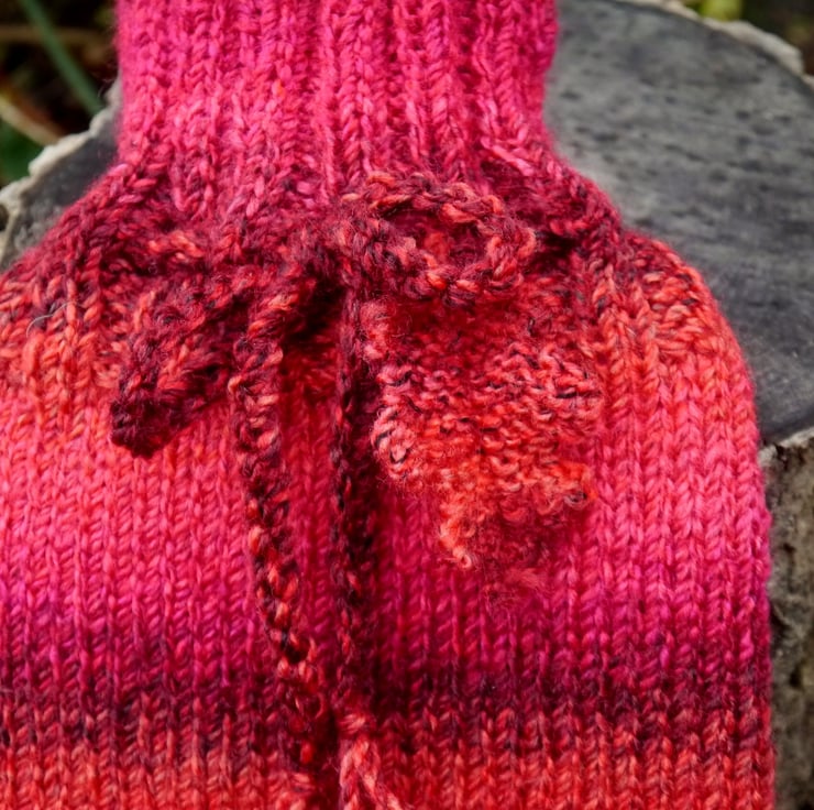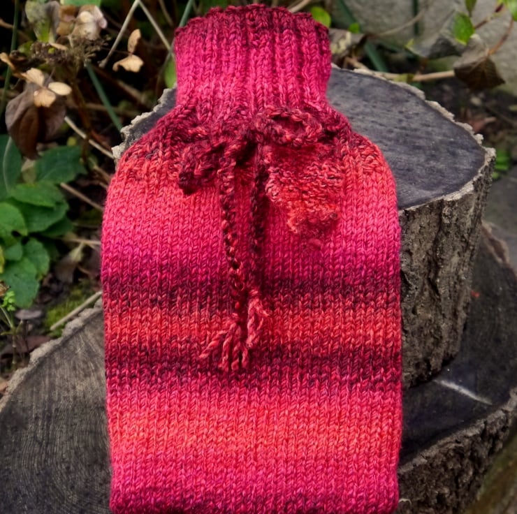 Snuggle up with this chunky hand knitted hot water bottle cover. Top opening with a drawstring tie and a knitted oak leaf attached. Made using a lovely marbled chunky wool which is machine washable.