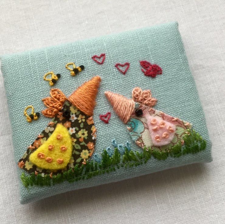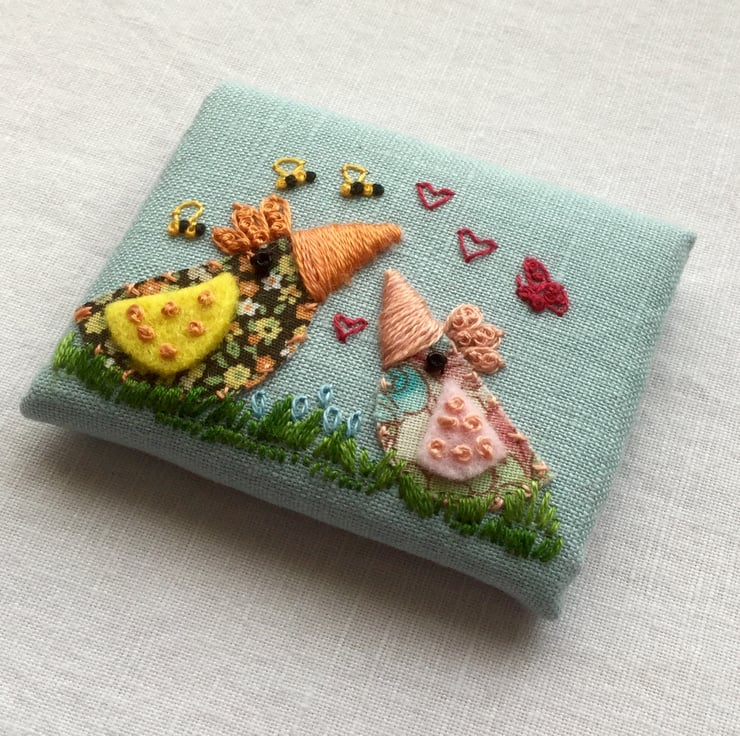 Hand embroidered brooch, I have used a pale blue linen for the base fabric and appliquéd vintage fabric for the chicks. Lazy daisy, french knot, straight and satin stitches have been used for the bees, hearts and butterfly.