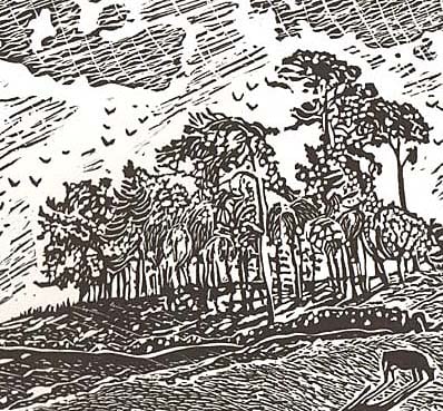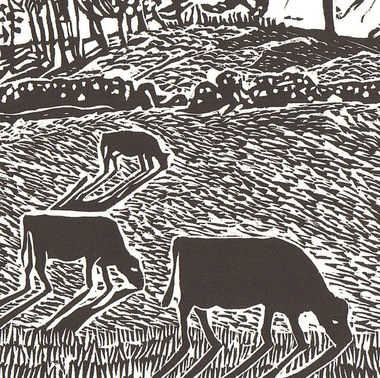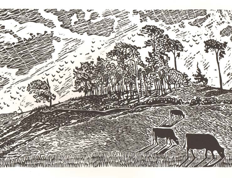 This is a lino-print I designed, cut and printed on a hand-press in my attic studio.