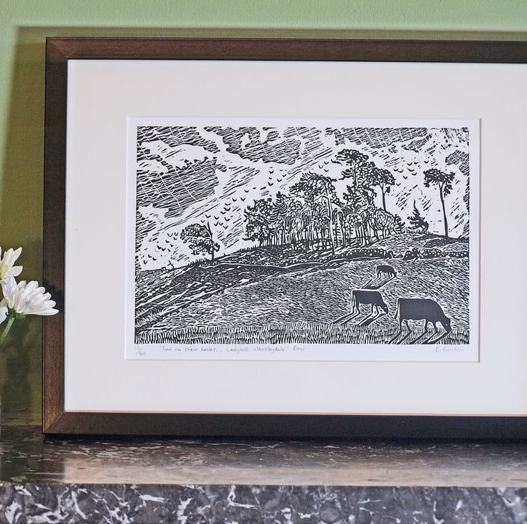 Firstly I draw the image onto a piece of lino. Then I carefully carve it out, before inking it with a hand roller using linseed oil based printing ink. It is then placed flat on my press, covered with Somerset Satin paper and the mangle like roller of the press is turned...