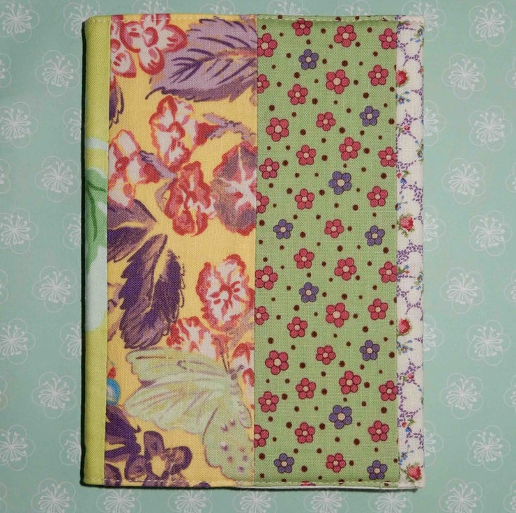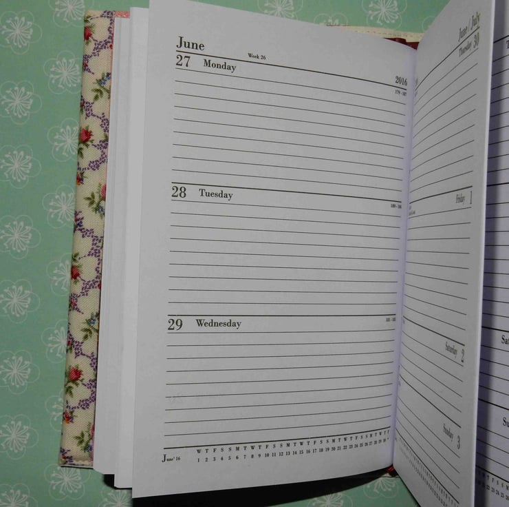 This is an A6 (approx. 6x4 inches) week to view fabric covered diary. It is covered in pretty fabrics in a patchwork style, in green colour tones. Complete with standard week to view diary, refills are easily available, for the next year. The cover is lined, interfaced and removable.