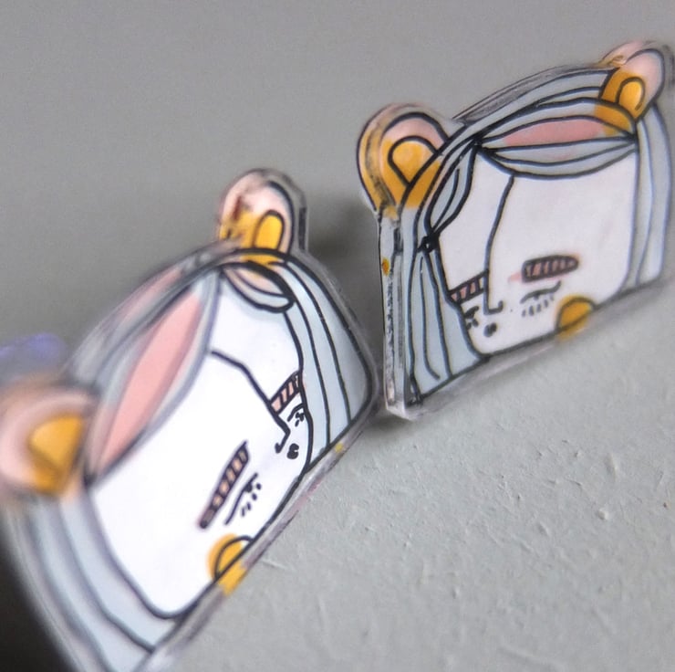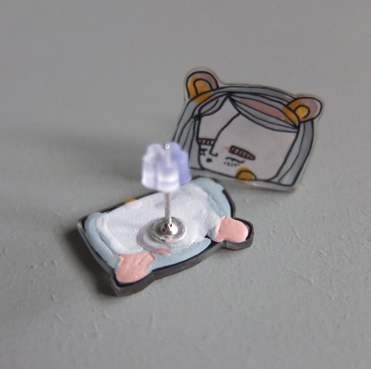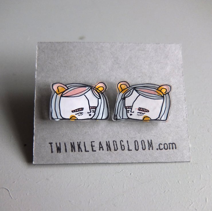 This listing is for a cute pair of Beary girl ear studs. She has blue and pink hair with mustard yellow accents.