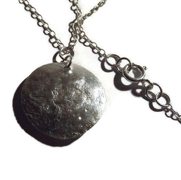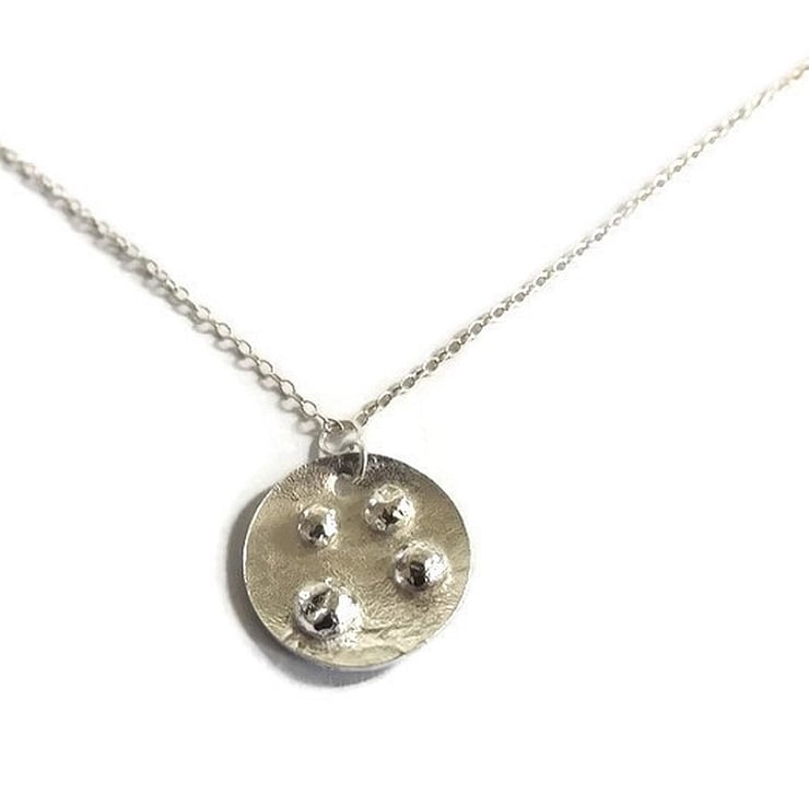An unusual, modern silver pendant featuring a sterling silver disc which has been embellished with sterling silver granules.