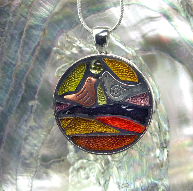 Unique and beautiful handmade stained glass pendant featuring a pair of birds on a branch against a glowing sun.