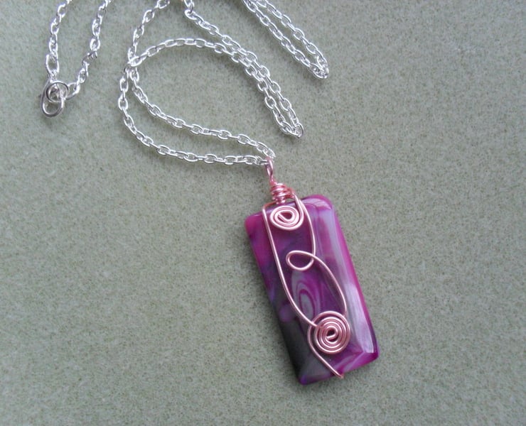 Deep pink agate pendant which has been wire wrapped with pink coloured copper wire and is suspended from a 18 inch silver plated chain