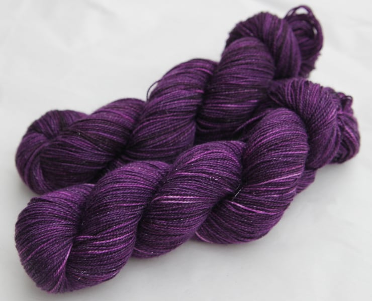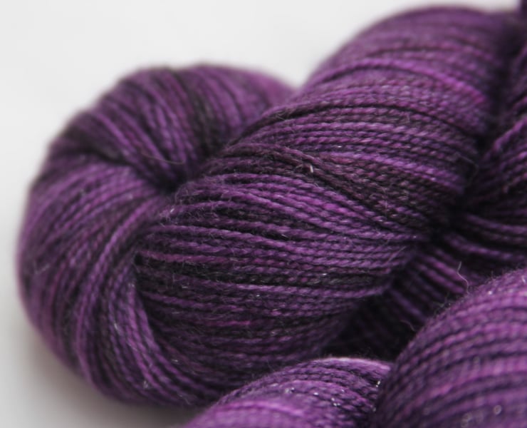 Semi-solid/subtley variegated purple with silvery stellina sparkles. This is a soft, lustrous 4-ply weight yarn with added stellina sparkles, that are almost impossible to capture accurately in photographs (they show as whitish flecks). In real life they catch the light and add a little sparkle. There is one skein left. Photographs have been taken and edited in bright but wintery natural light.