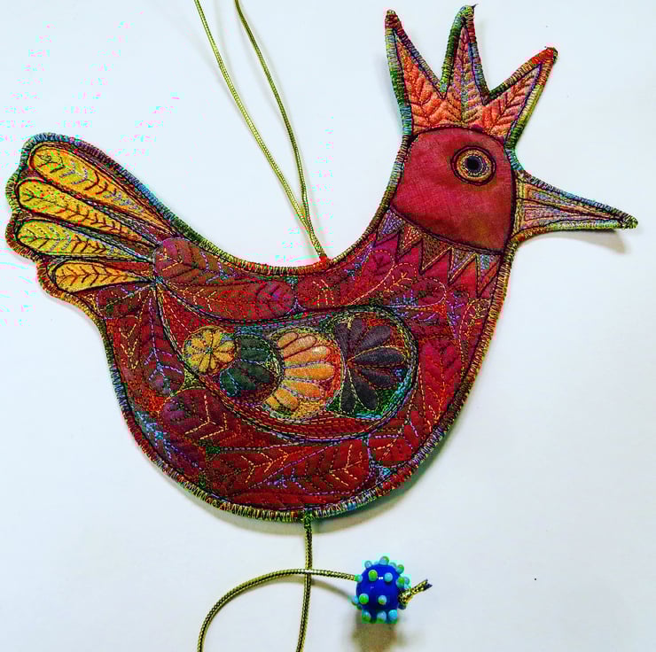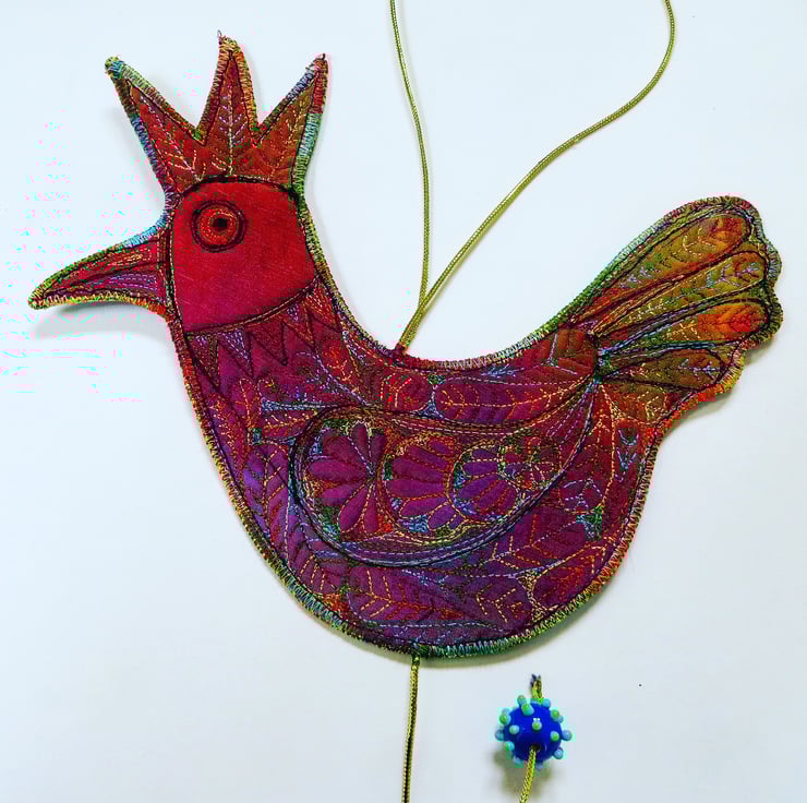 This is a festive bird hanging decoration made from layers of fabric including my own hand dyed Egyptian cotton and lots and lots of free machine embroidery. It also has one of my own handmade glass beads on the bottom of the gold cord. It has a loop to hang it up from.