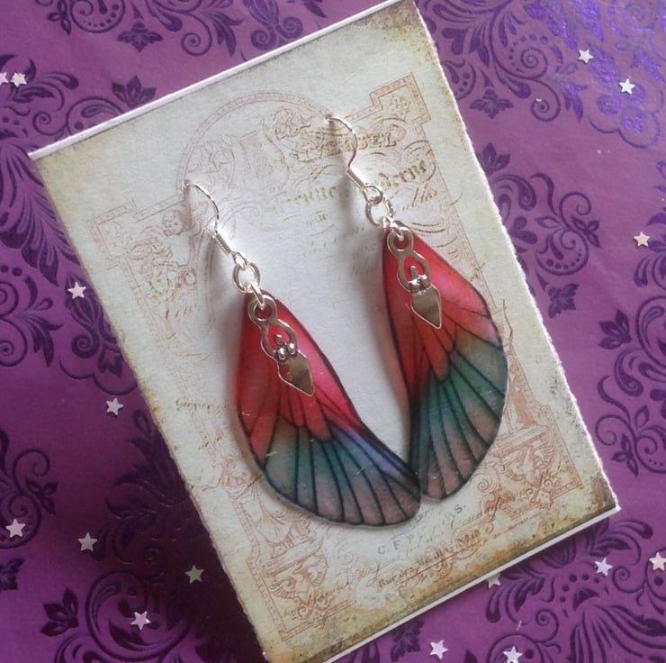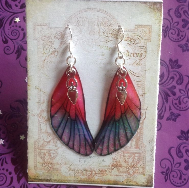 Shimmering red goddess Mackintosh style medium fairy wing earrings.