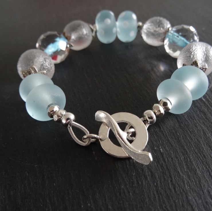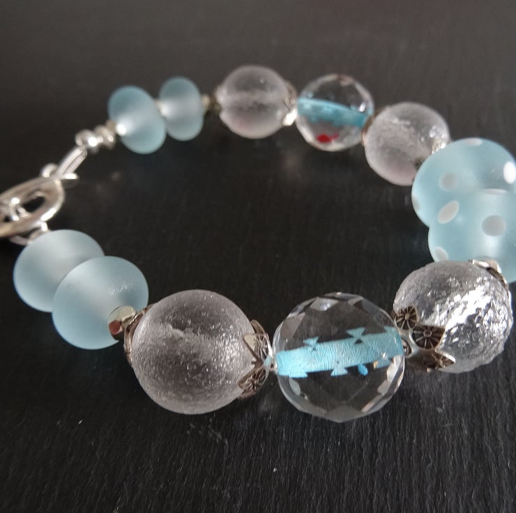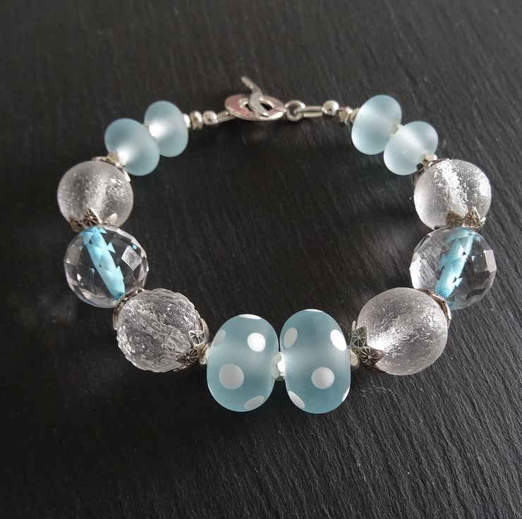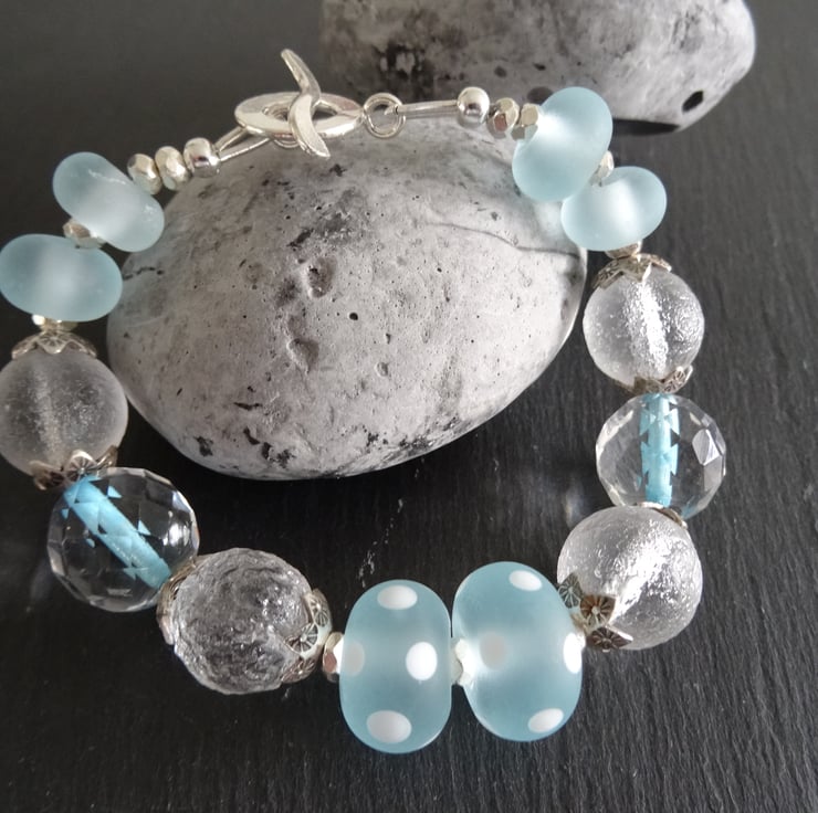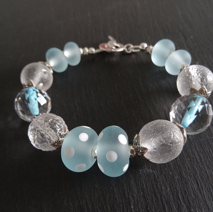 This is a lovely bracelet made with handmade lampwork glass beads (by Lampwork beads by Jo) and Karen Hilltribe silver beads. The spotty lampwork beads are 16mm x 10mm rondells and the plain lampwork beads are 12mm x6mm rondells, the colours are aqua blue in a beautiful etched finish. I have also added czech glass 14mm round clear sugar frosted beads and faceted czech glass blue core beads also 14mm round. I have added hilltribe silver bead caps and 4mm faceted silver spacer beads. The bracelet measures 20 cm (8 inches) and closes with a handmade hilltribe silver toggle clasp. Karen Hilltribe silver is made by the Karen tribe in the hills of Thailand,the silver is purer than sterling at 999 as opposed to 925 of sterling. As all of the items in my shop are unique, individual pieces made by myself, this is the bracelet you will receive. It will arrive gift wrapped in tissue paper and a organza bag.