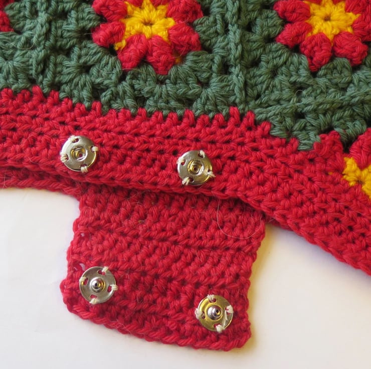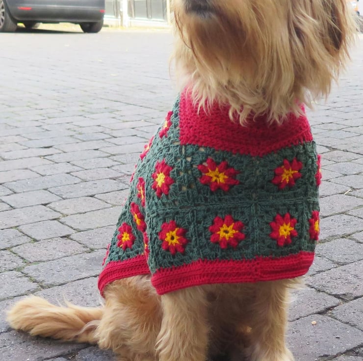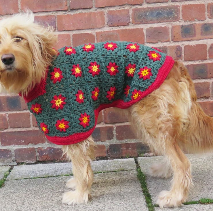 The dog coat is designed to fit snugly over the back and fasten with a tab/band under the tummy. The festive pattern features poinsettia-coloured flowers for Christmas, but you can use any colours for extra fun.