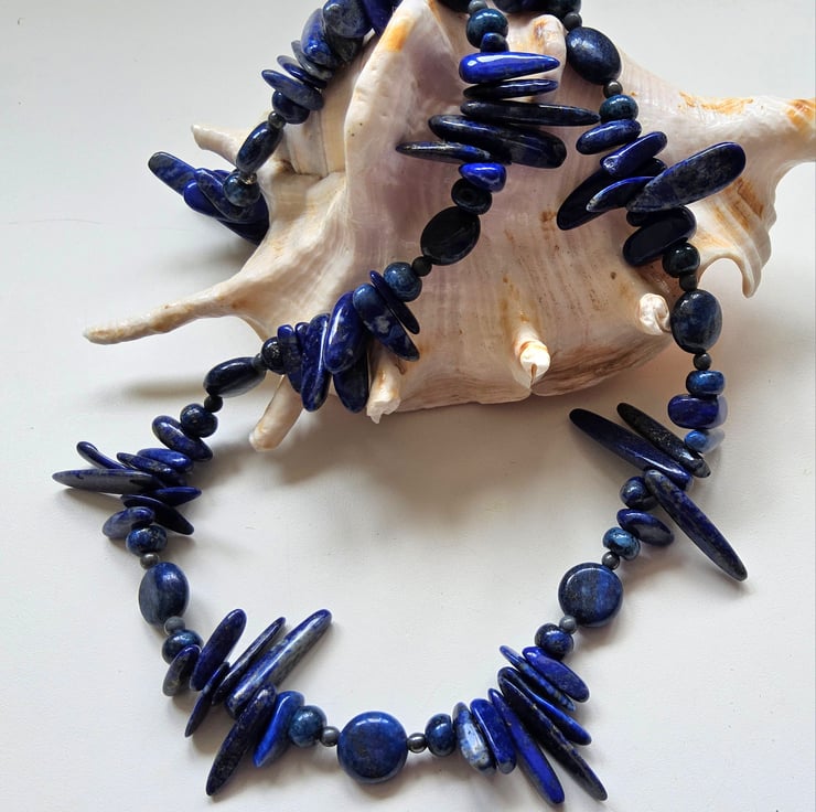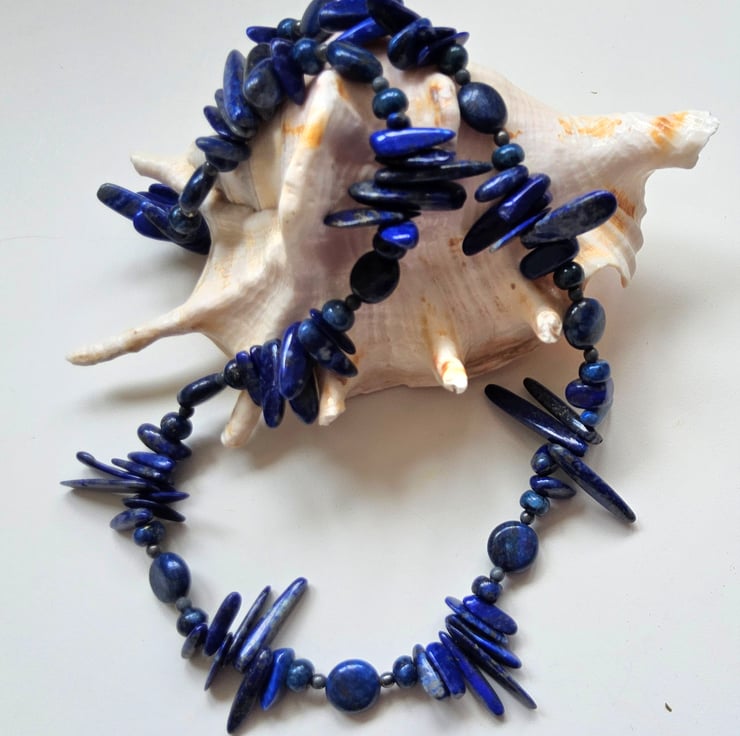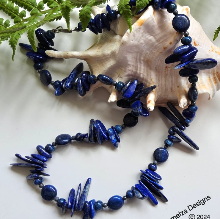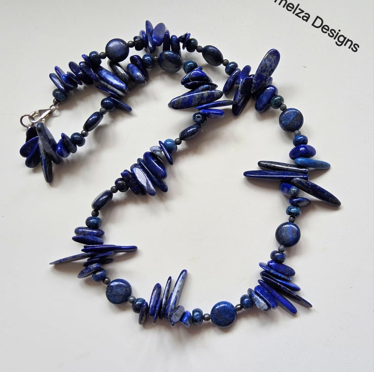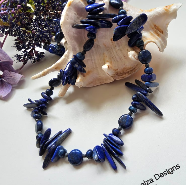 This stunning organic looking necklace has been made from quality lapis lazuli irregular long tooth, flat 10mm coin and 6mm round gemstones with 925 sterling silver spacer beads within the design. The necklace has been constructed using flexible professional stainless steel jewellers wire for addeded strength and lasting durability, finished off with a 925 sterling silver clasp. It would be the perfect gift for ladies of all age group and skin tone.