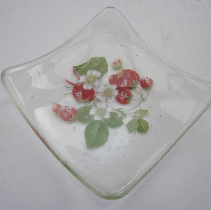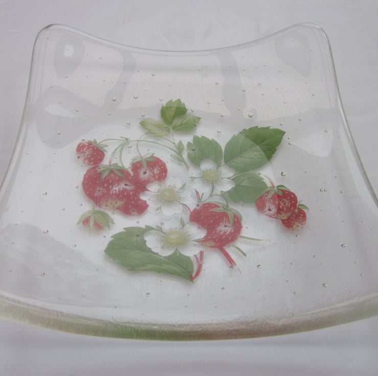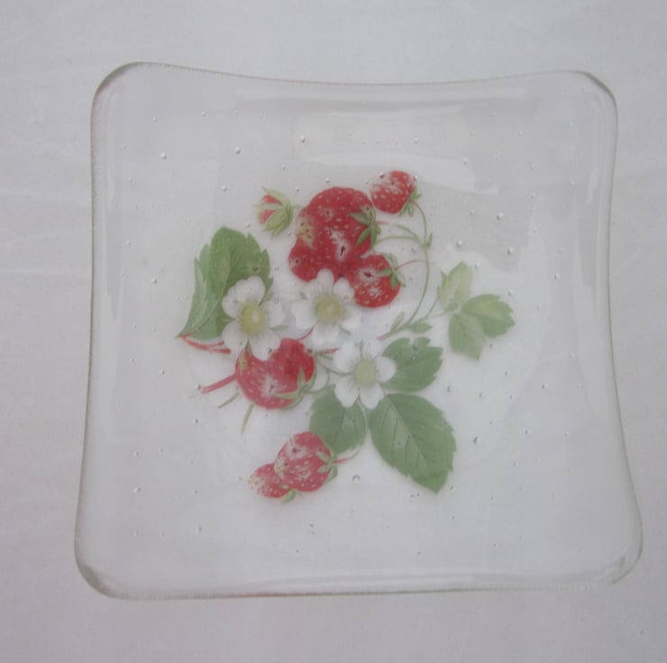 This square bowl has a lovely strawberry design melted into it and is approximately 5 1/2 inches across. It has been fully annealed to make it strong. This would make a great gift or treat.