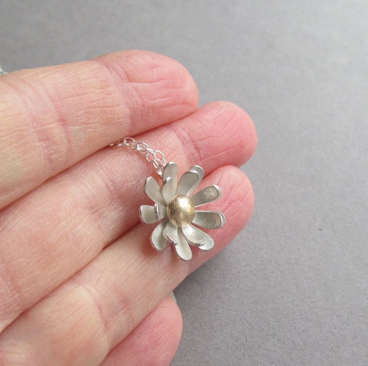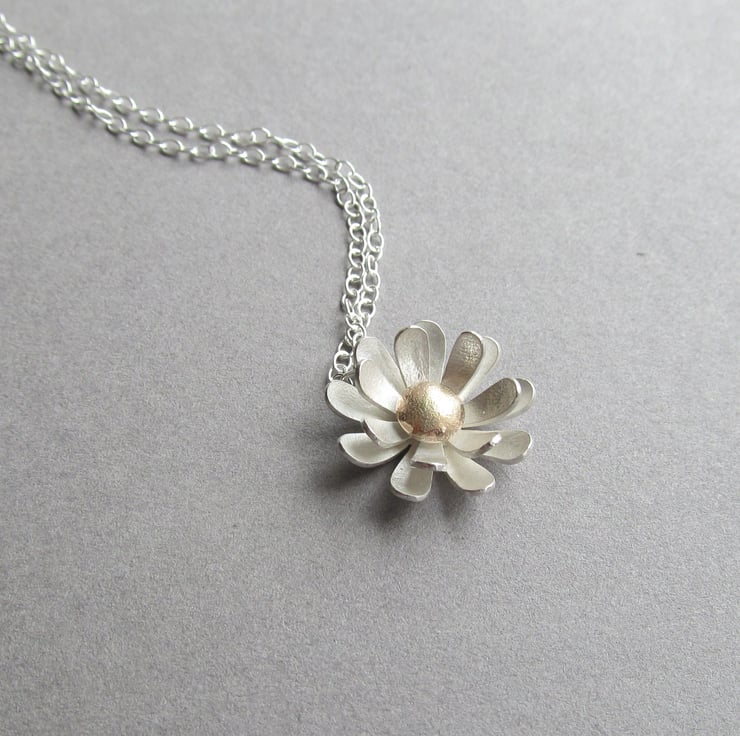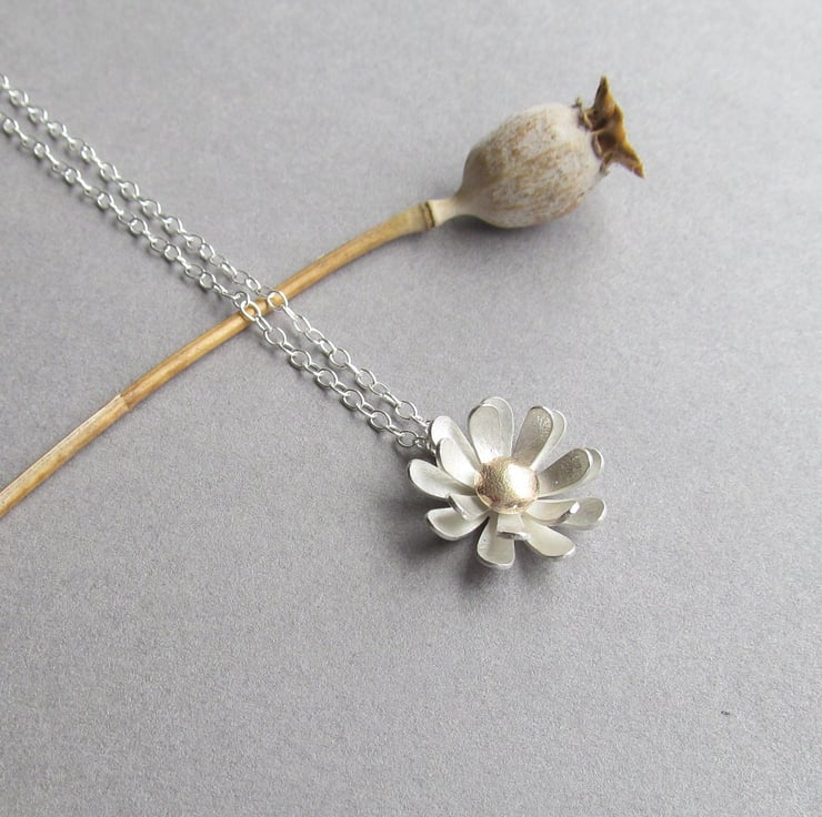 This little Sterling silver and 9ct gold pendant is part of the 'Daisy at Dusk' collection and entirely made by hand.