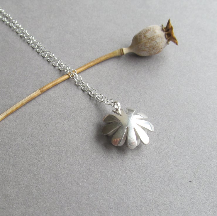 Each layer of petals is carefully textured, hand-pierced and domed and then individually soldered together, layer-by-layer, with the gold seedpod centre. Finally, a tiny ring is soldered onto the back for the chain to pass through and the tips of the petals burnished to add a little sparkle. The daisy pendant measures approximately 18mm across and comes on a fine 45cm (18") Sterling silver trace chain with a bolt ring clasp.