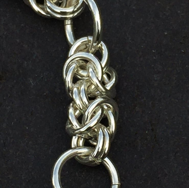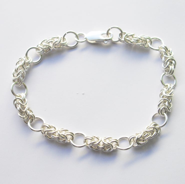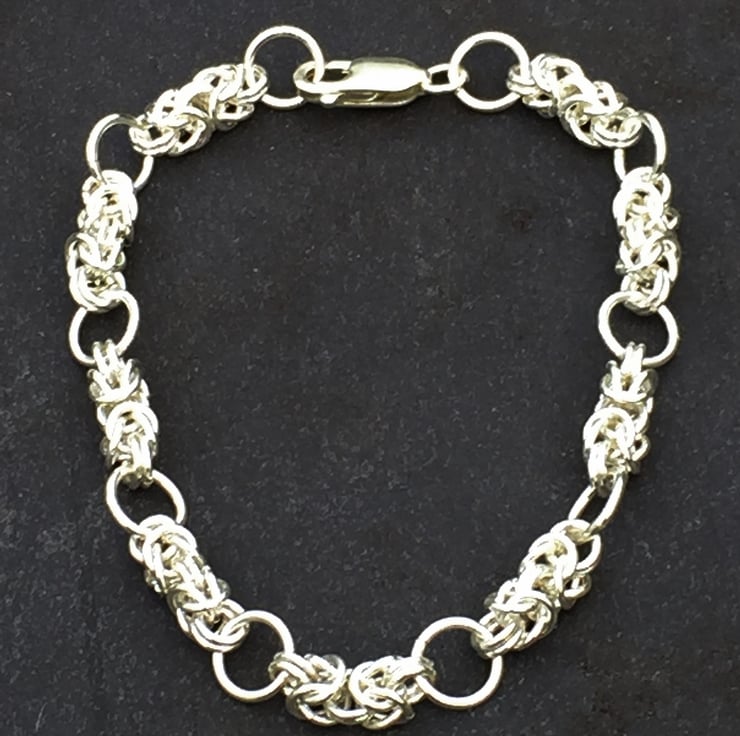 This beautiful bracelet is hand made from sterling silver in a byzantine knot design.