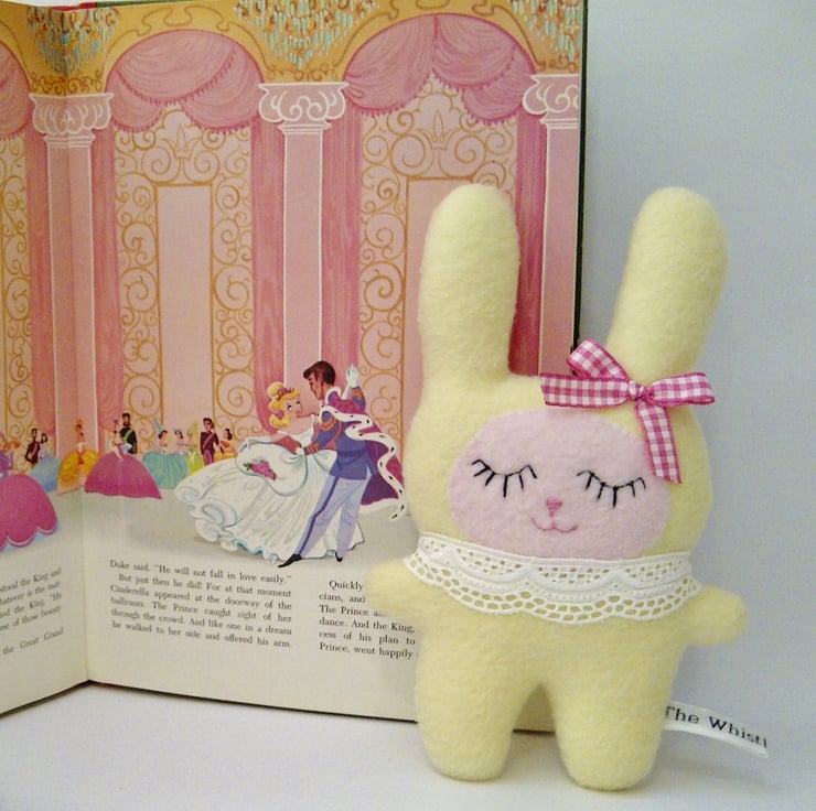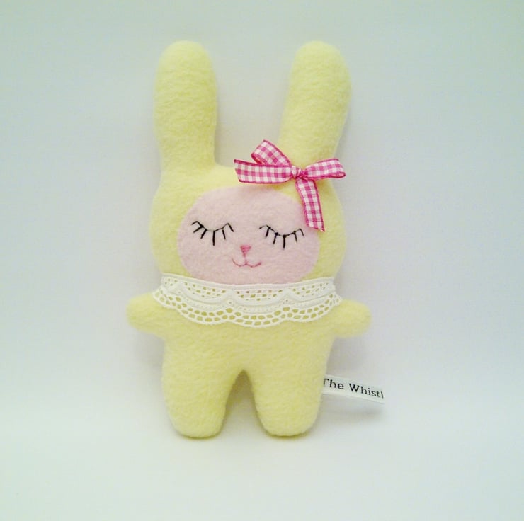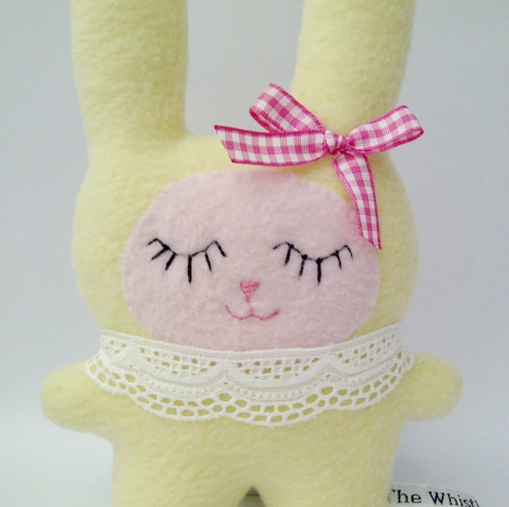 Sewn using pale yellow fleece fabric, with a hand stitched pale pink fleece face. The sleepy eyes and the nose and mouth are securely sewn using black and pink embroidery thread. Both the collar and bow are securely sewn onto the bunny by hand.