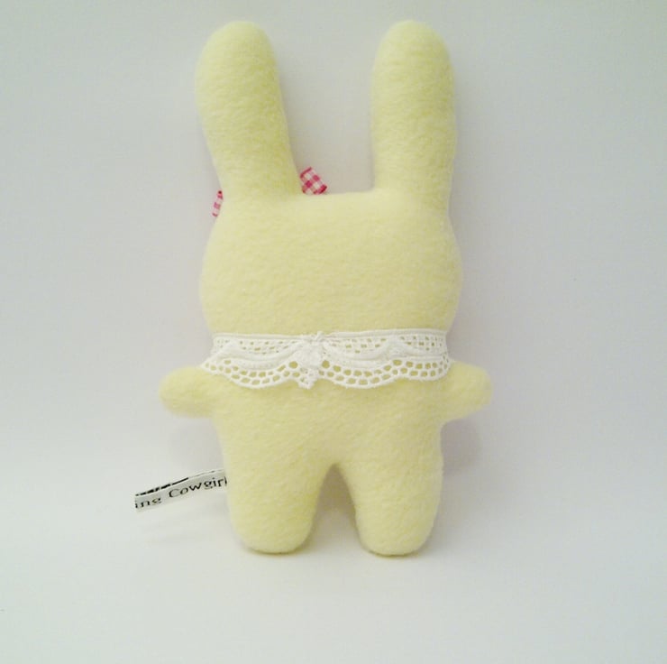 This little yellow bunny rabbit soft toy plush is very sweet and happy! Wearing a white cotton lace collar and with a pink gingham bow. A small rabbit with a big heart!