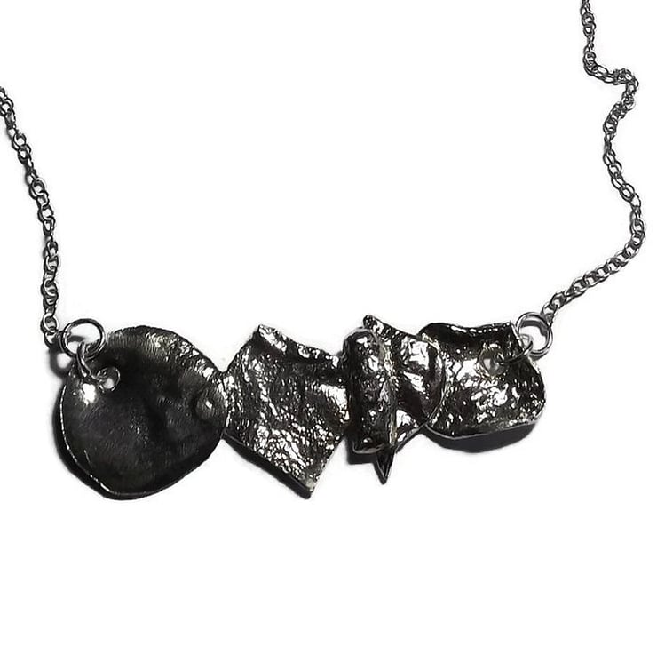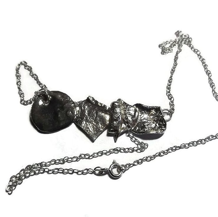 A pendant handmade by fusing scraps of sterling silver together with heat, creating a new unique piece of jewellery.