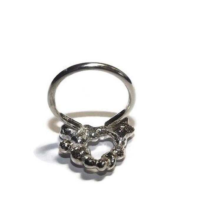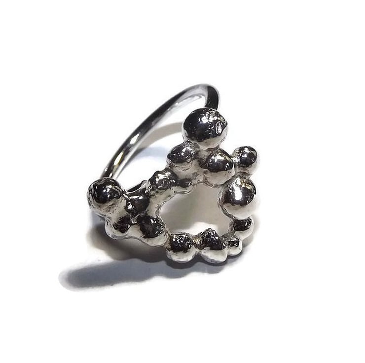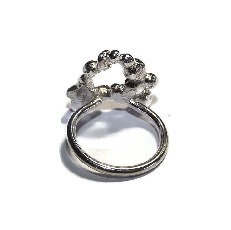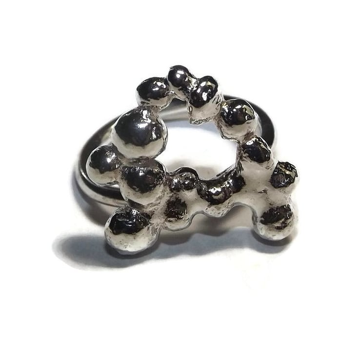 A ring handmade from fused sterling silver pieces which have been joined together with heat from a flame, creating this unique abstract shape.