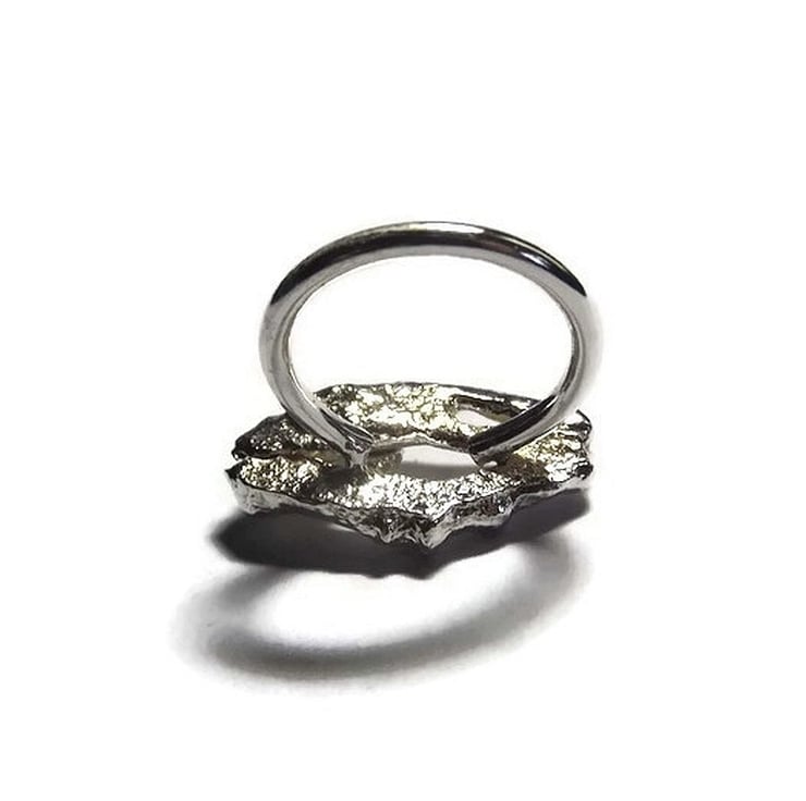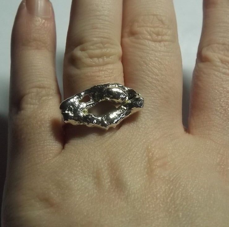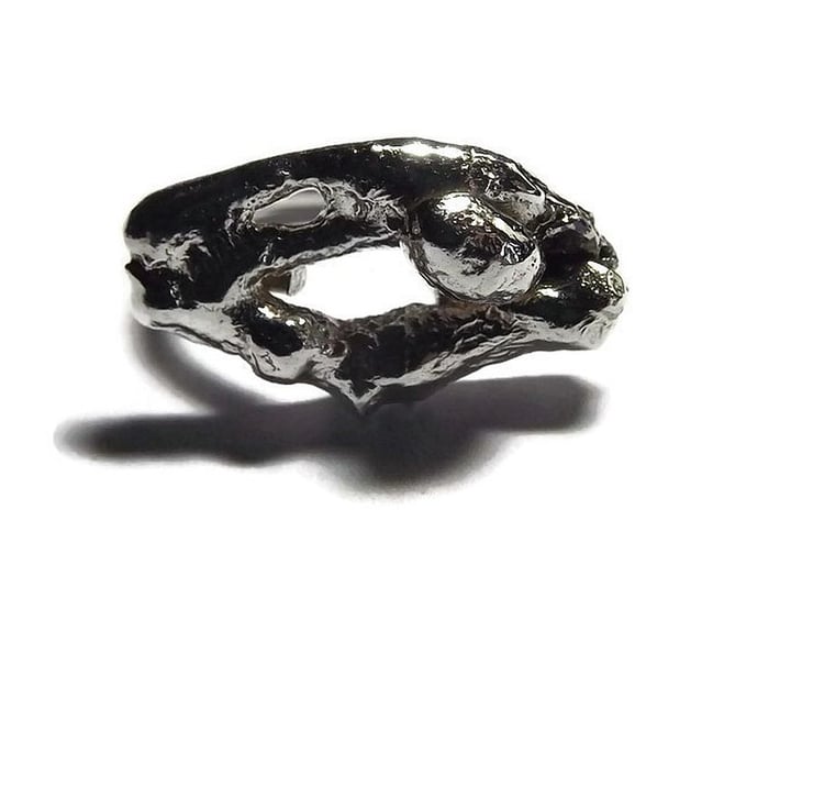 A handmade ring created by fusing pieces of sterling silver together with a flame creating this unique abstract and shape which kind of resembles craggy rocks.