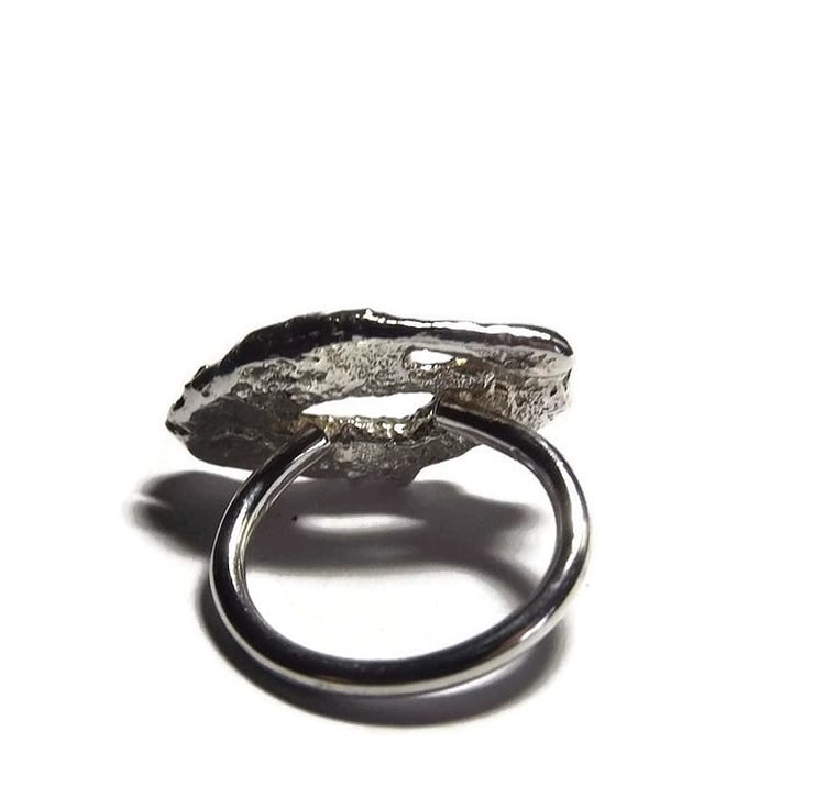 The shape sits on a ring shank which has been made out of 2mm round sterling silver wire and is a size L