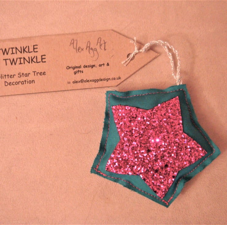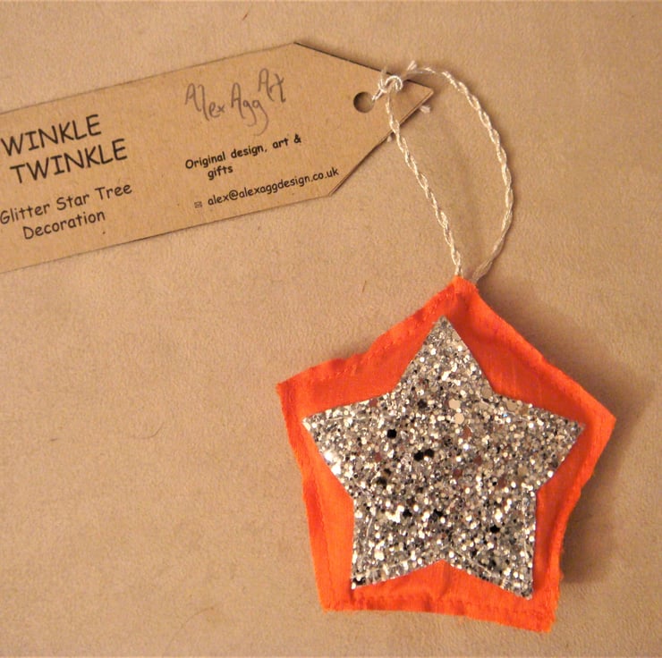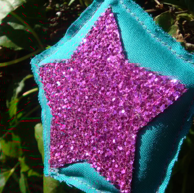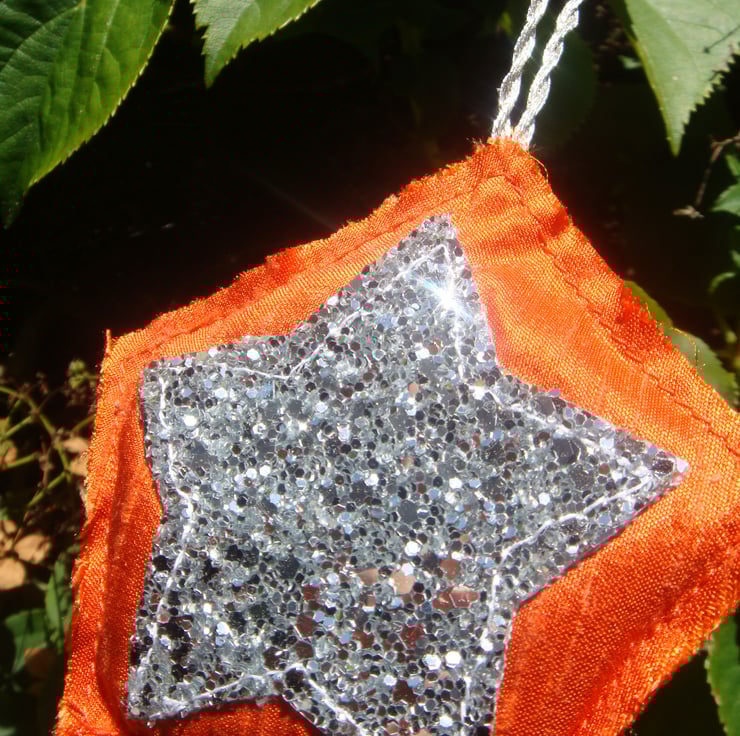 Handmade in beautiful tangerine raw silk and smart turquoise poplin each with a fab glitter fabric star motif. 9cm across, hangs approx 14cm long including loop. See my shop for my new ice blue version!