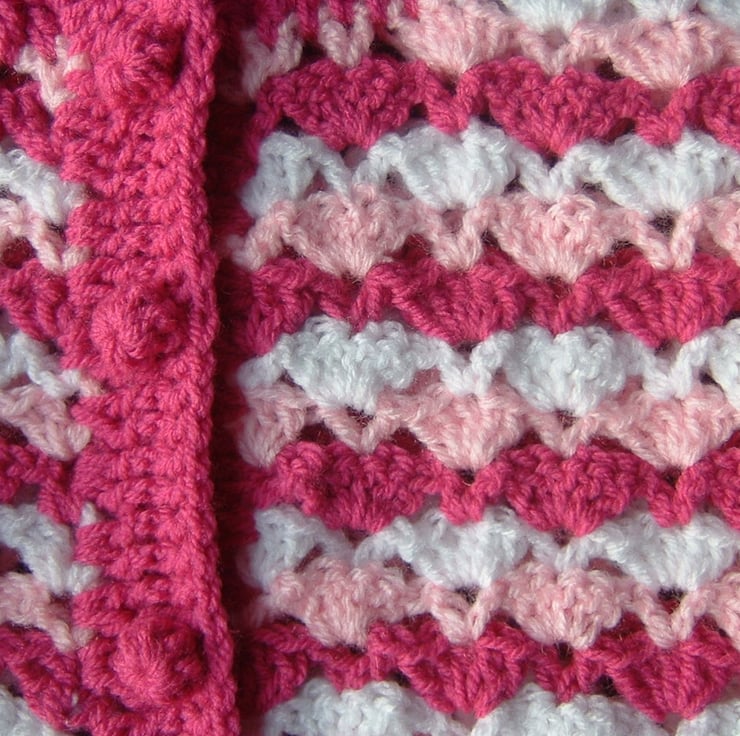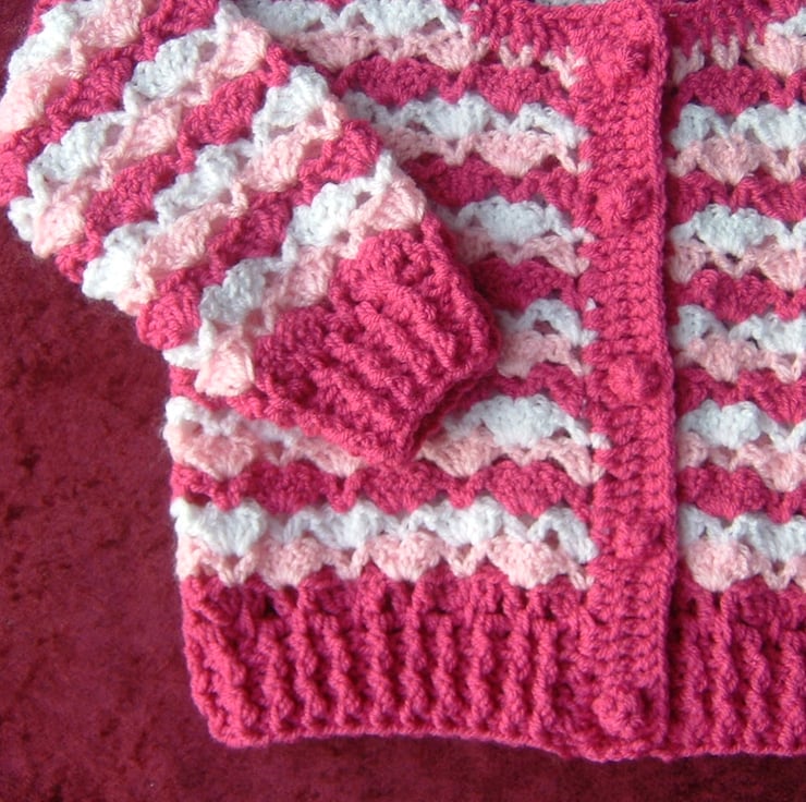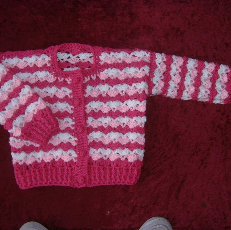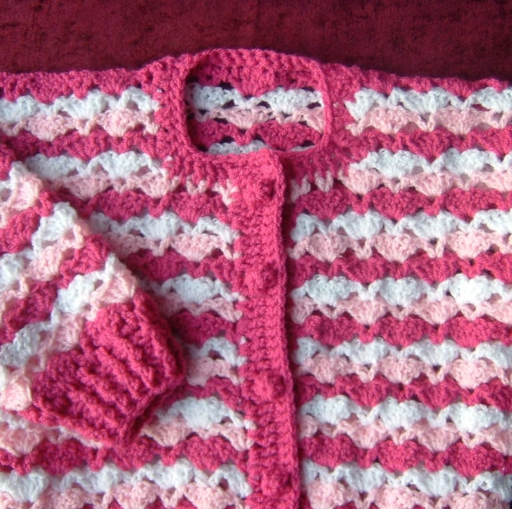 Created in 100% acrylic yarns in cerise, pink and white, with matching hand crocheted buttons it is machine washable on a cool 40 deg wash.COOL tumble dry. Do NOT iron.
