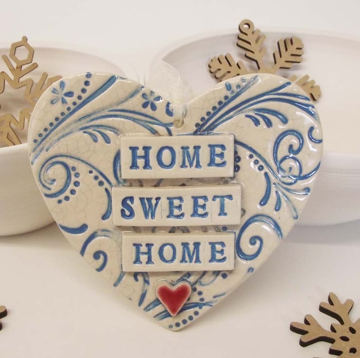 This ceramic heart is made from white earthenware clay and decorated with the words, Home is where the Heart is.