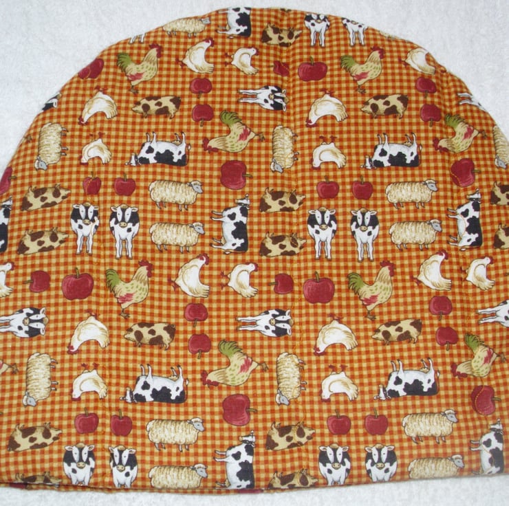 Cows, sheep, pigs, hens and apples tossed on an orange check background. Tea cosy , size 26cm wide , 27cm high , will keep tea hot for up to half an hour after it is made . oven gloves are lined with heatproof material and are ideal to use with oven or microwave cooking.