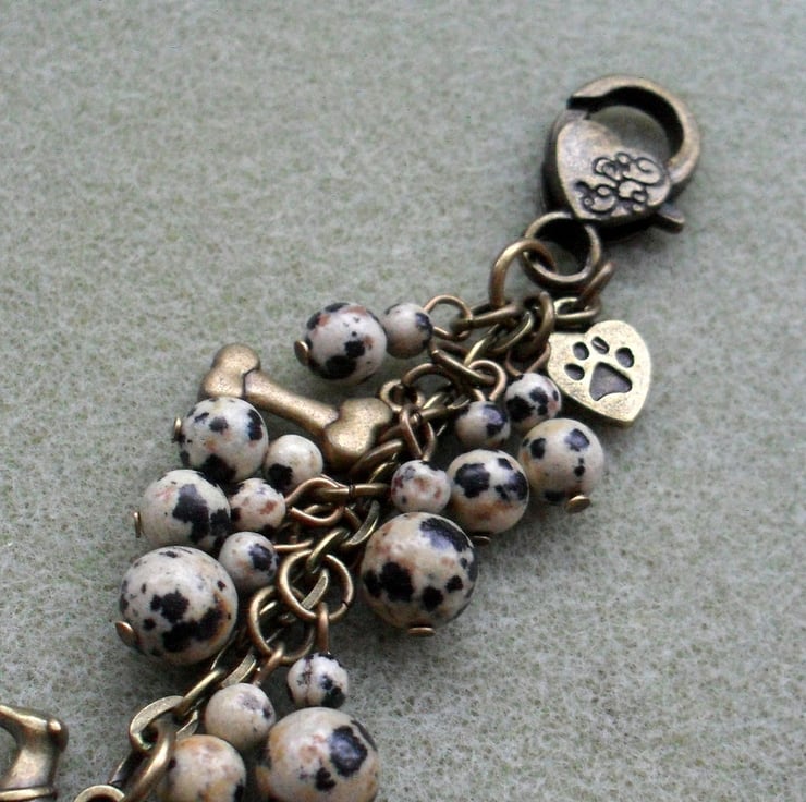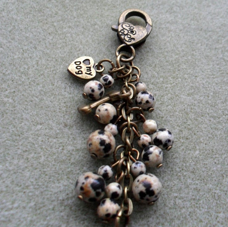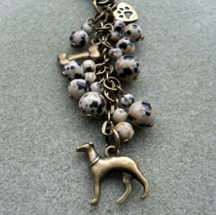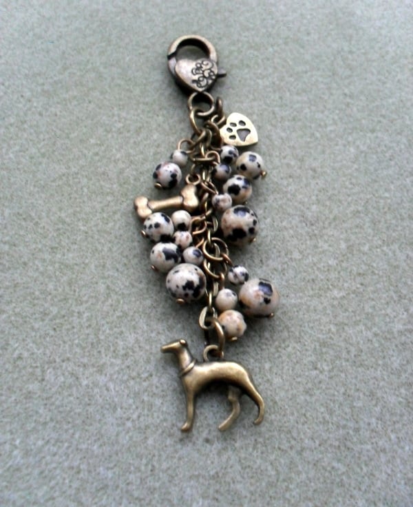 Greyhound bag charm with Dalmatian jasper beads are attached to a bronze tone clasp.