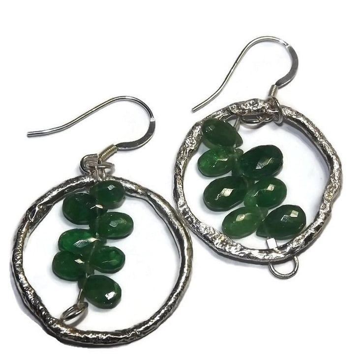 A pair of earrings featuring reticulated sterling silver wire hoops and natural tsavorite garnet briolette beads.