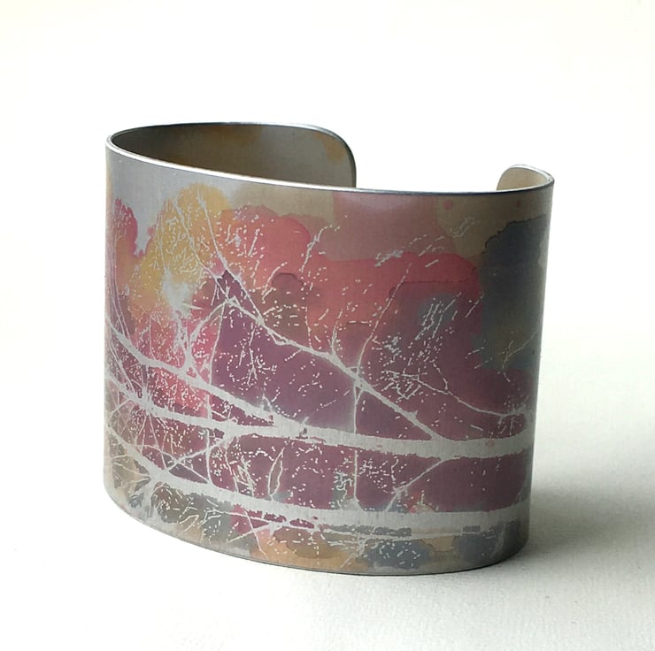 A fab cuff with the lengthways image of a tree silhouette, dyed in soft red, bronze and grey. The image is taken from my own photograph. Please note your cuff may vary slightly from the image as each one is dyed by hand.