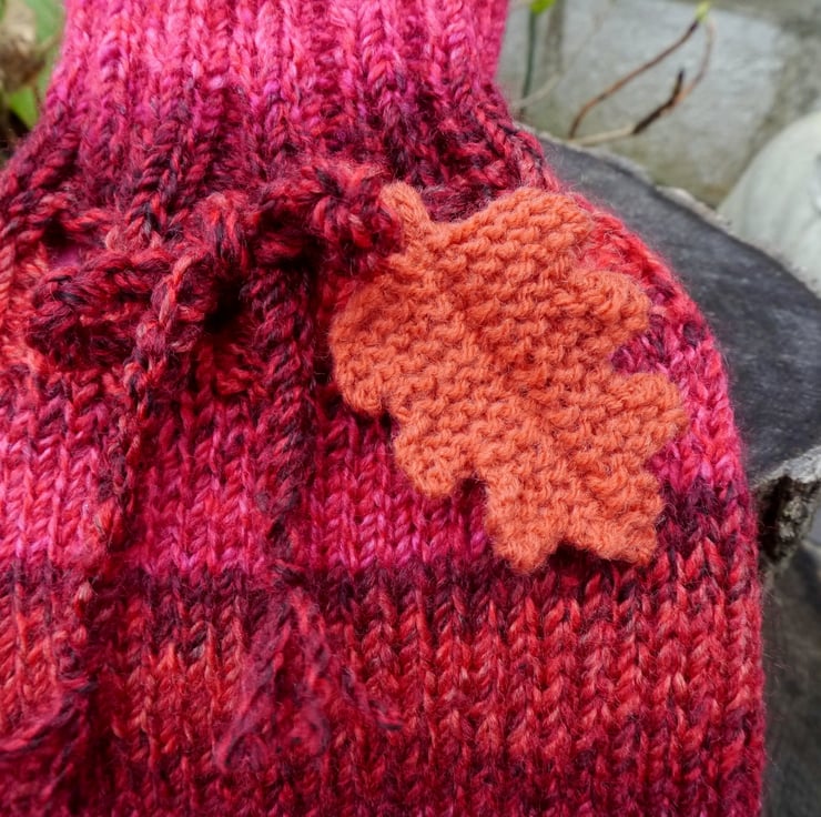 Cuddle up with this chunky hand knitted hot water bottle cover. Top opening with a drawstring tie and a rust coloured knitted oak leaf attached. Made using a lovely marbled chunky wool which is machine washable.