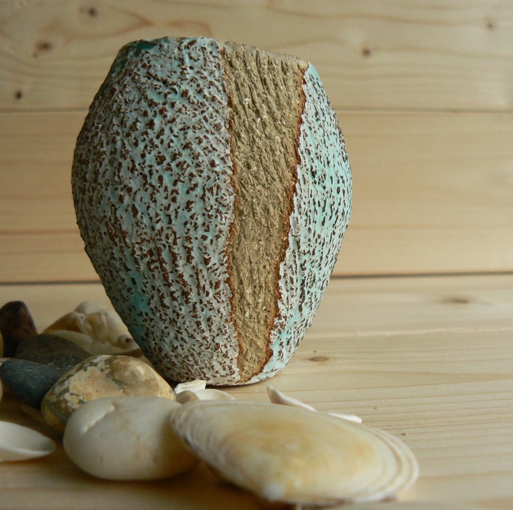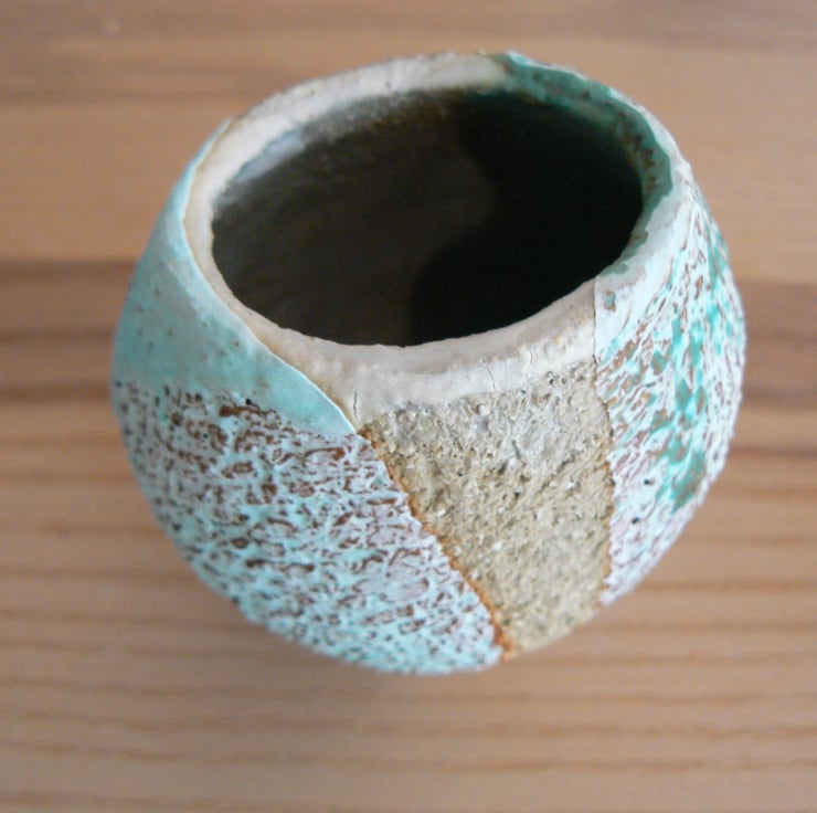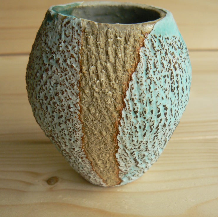 Made from a buff grogged clay it has been fired to 1240 C and is finished with a dry turquoise glaze outside and a clear shiny glaze inside so it can easily be used to hold water.
