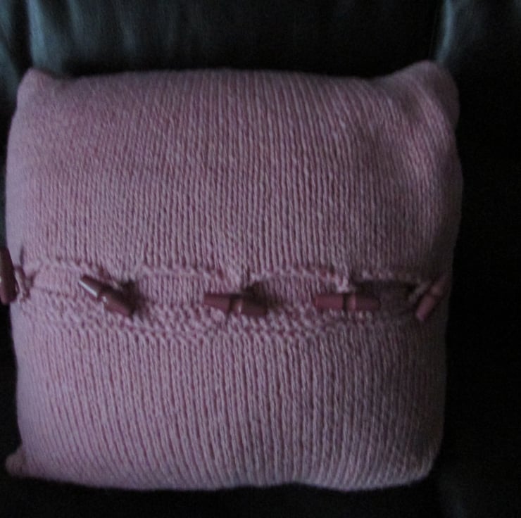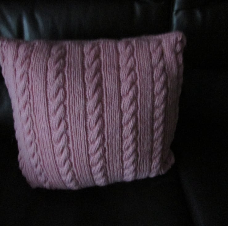 Hand knitted Arran cushion cover with cable and stocking stich panels, the cushion cover has an envelope style opening on the back and is fastened with 4 buttons, and is knitted in a 25% wool, 75% acrylic yarn and is machine washable on a wooll cycle, the cushion cover measure 41x41cm. This style cushion looks fantastic on a leather sofa or chair