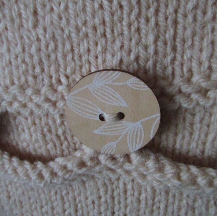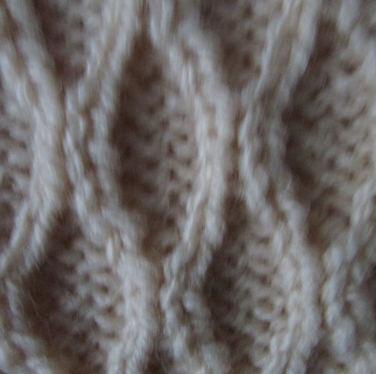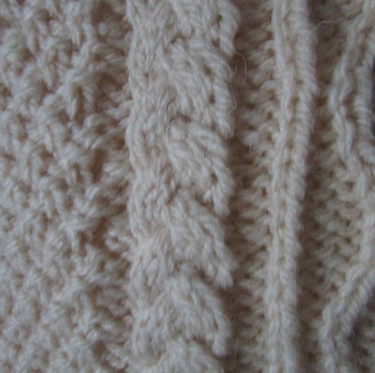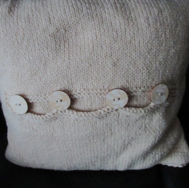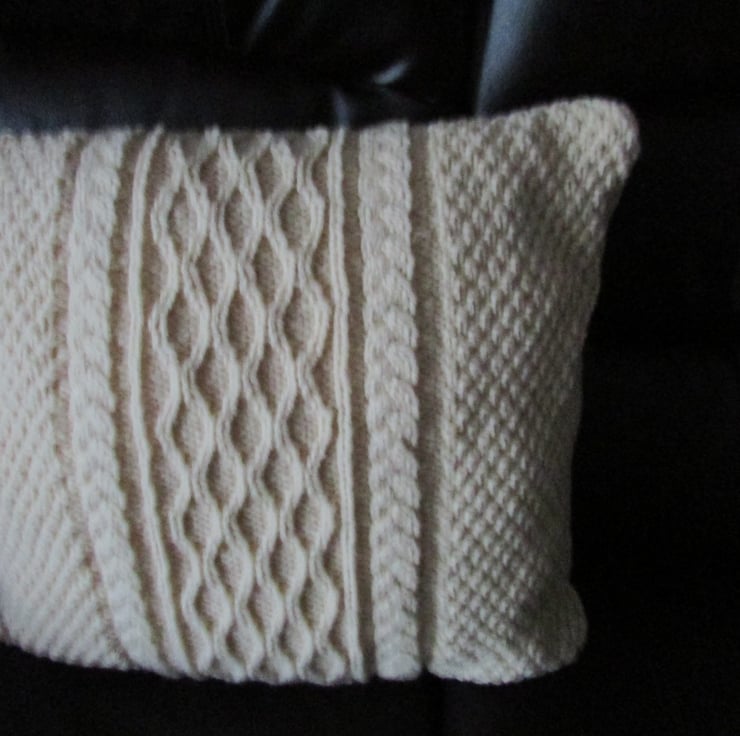 Hand knitted Arran cushion cover with panels of double moss stitch, cable and a central panel of hour glass cable, the cushion cover has an envelope style opening on the back and is fastened with 4 buttons, it is knitted in a 25% wool, 75% acrylic yarn and is machine washable on a wool cycle the cushion cover measures 41x41cm.