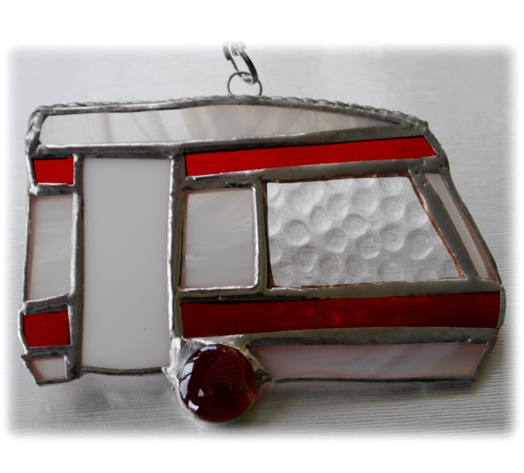 One of my special designs, a caravan, classic shape with lots of lovely clear and white glass and a gorgeously bubbled window. It has stripes in two shades of red and a bright red nugget wheel to match.