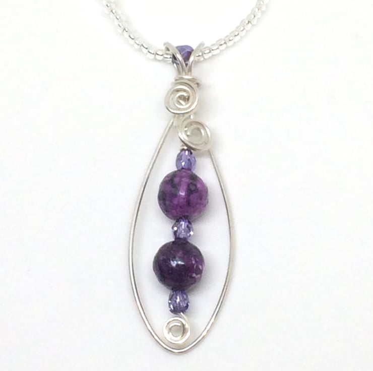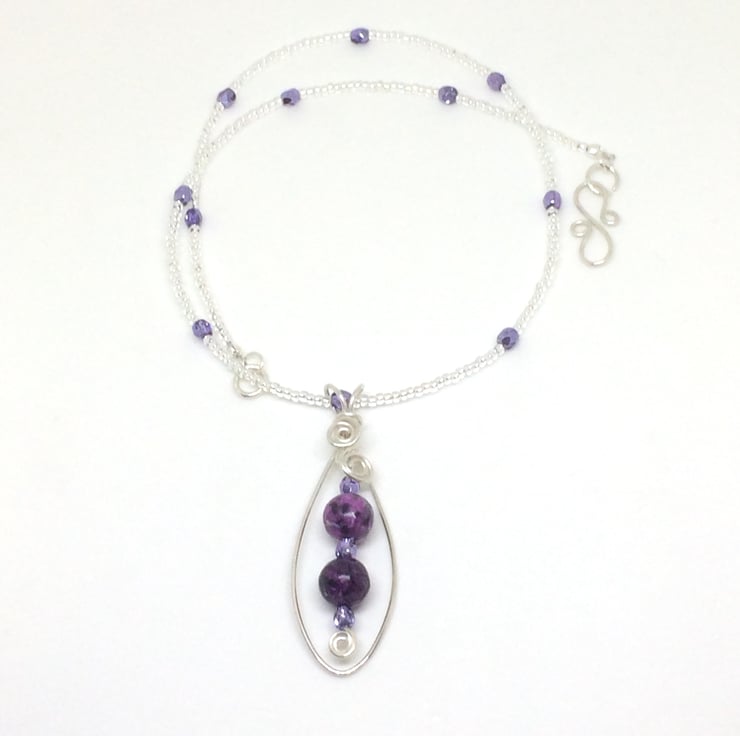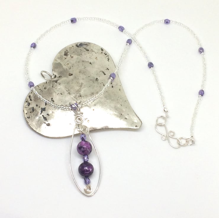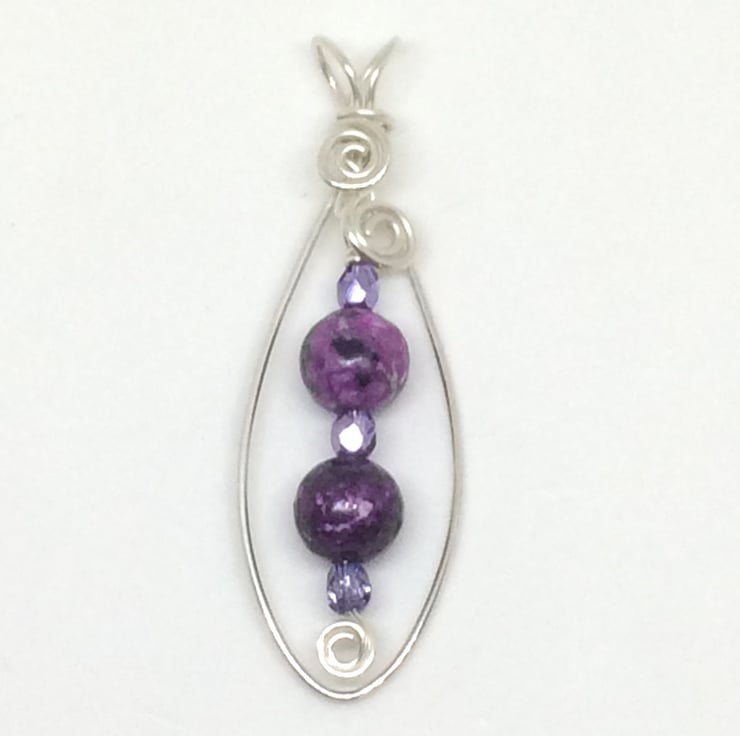 I have formed sterling silver wire into an oval shape, purple Jasper beads and Czech violet ice crystals hang from the centre of the pendant. The colours of the beads complement each other beautifully. The pendant hangs on a crystal and seed bead necklace. I have used wire wrapping techniques to make this pendant and have finished the necklace with a sterling silver handcrafted clasp.