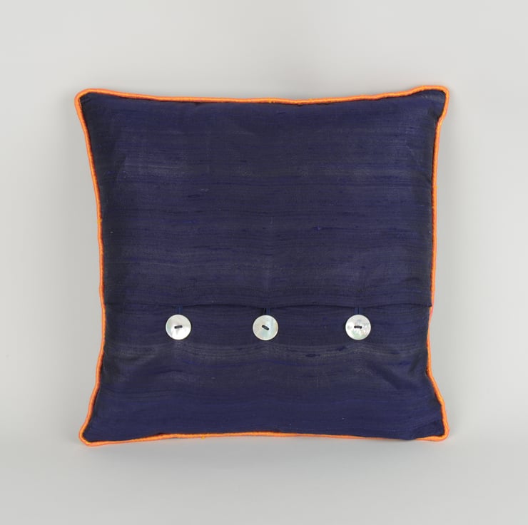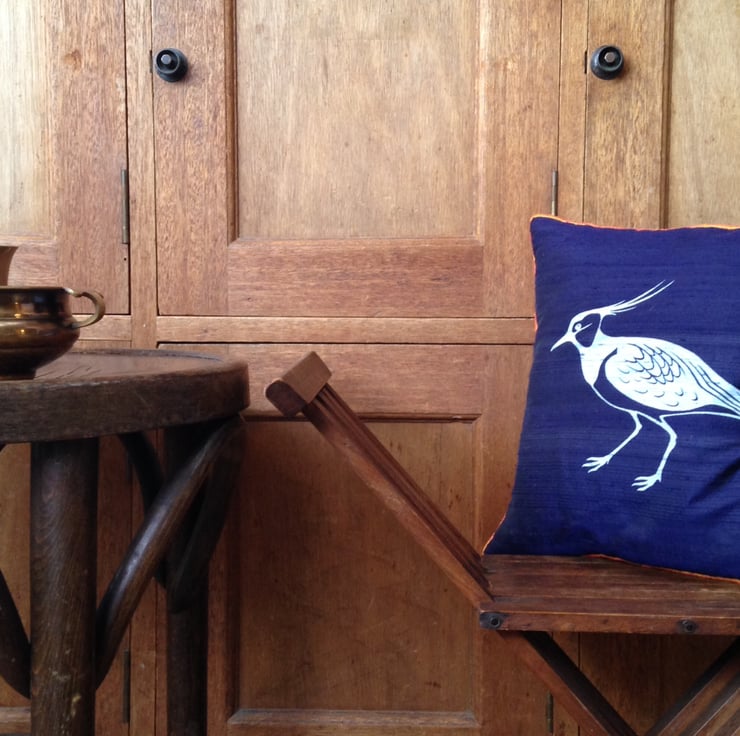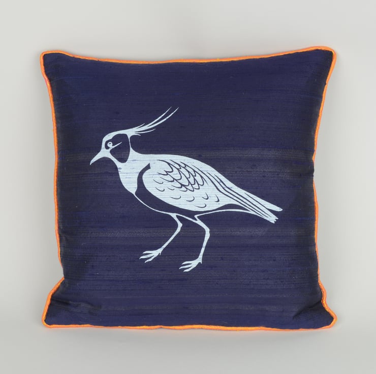 Hand screen printed cushion on dark blue silk that is shot with black creating a beautiful play with light. The contrasting hand made piping is in a yellow silk that is shot with pink silk creating a rich gold like effect. The lapwing is printed in a very pale blue ink. The back of the cushion is fastened with three mother of pearl buttons and ribbon button loops. The silks used are raw silk creating beautiful natural textures in the fabric, making it a very tactile item. The cushion cover fits and is supplied with a 13 inch square feather pad.