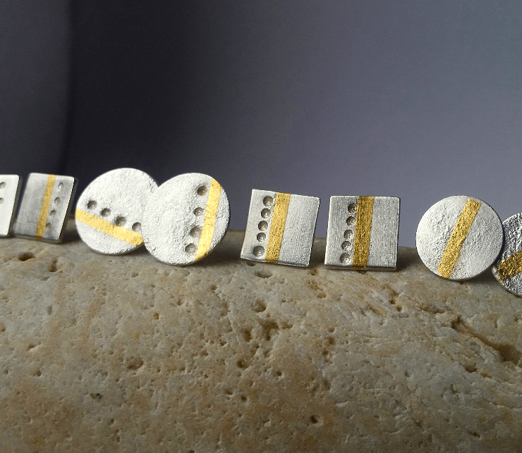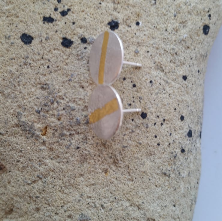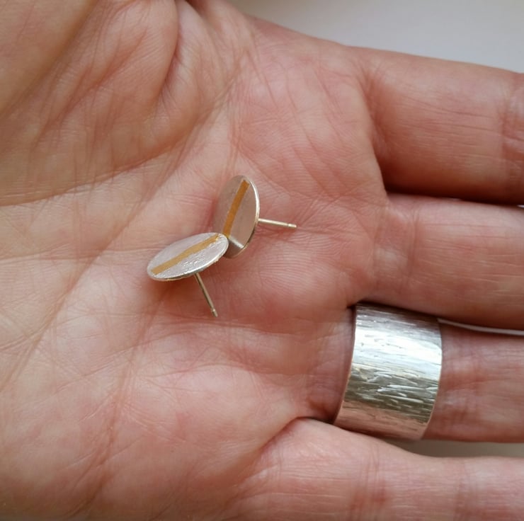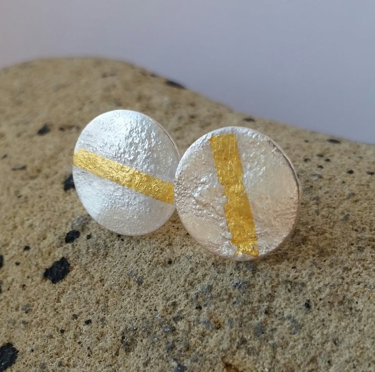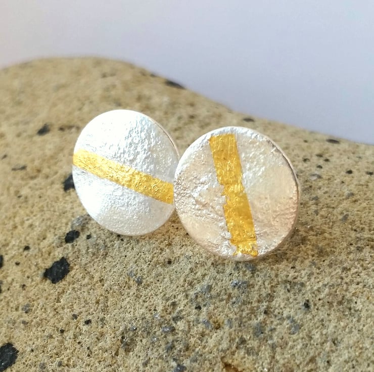 This is a pair of sterling silver textured stud earrings with delicate lines of 24 ct gold which have been added using the ancient Korean process of Keum Boo.