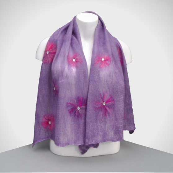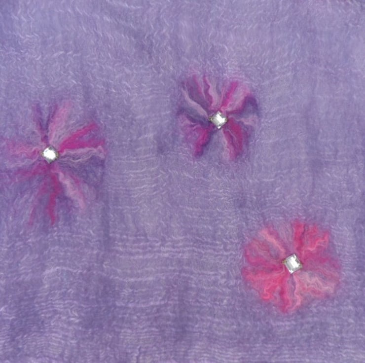 This scarf has been nuno felted using soft merino wool in a heather shade of purple. It has been felted onto both sides of a pale purple silk chiffon scarf and decoration in the form of "starbursts" has been added to one side using pink and purple shades of merino wool. Clear faceted acrylic rhinestone gems have been sewn on to accentuate the starbursts giving a sparkling finish to the design.