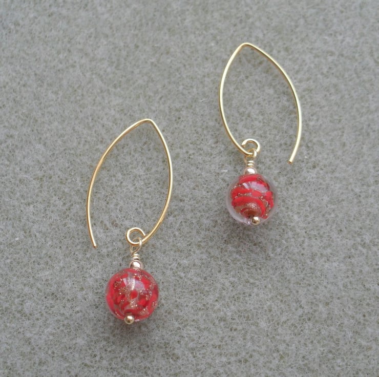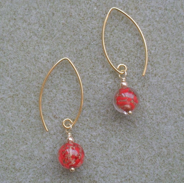 Red venetian murano glass beads with aventurina are attached to gold vermeil V shaped ear wires