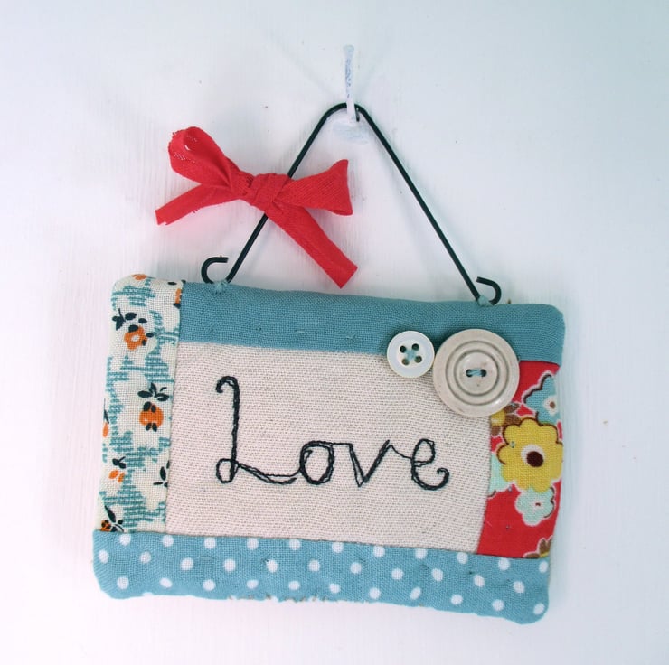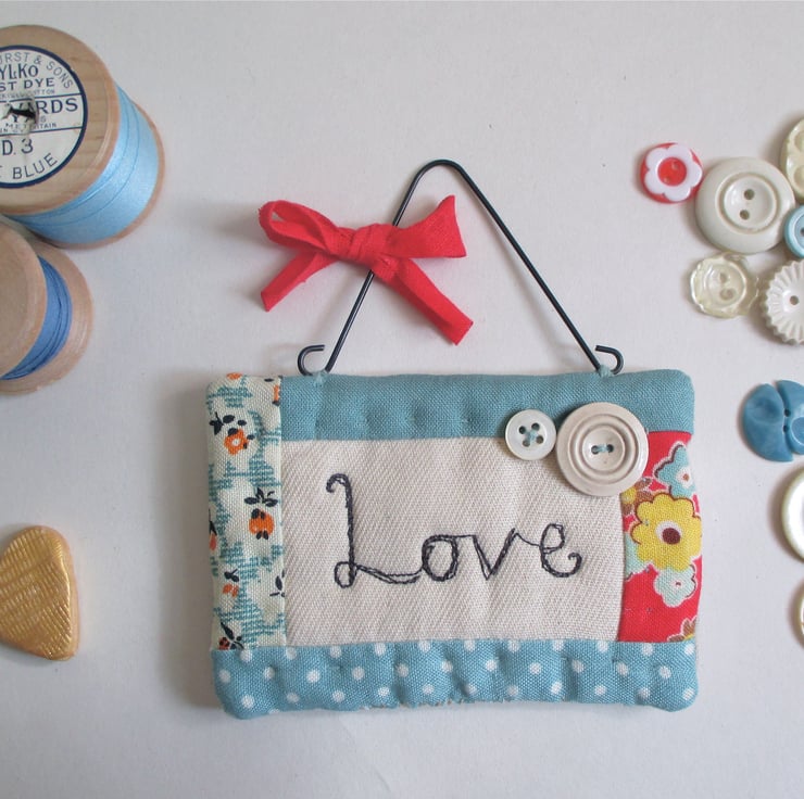 Embroidered freehand on a sewing machine and patchworked into a quilted panel, the lovely muted colours are set off with vintage button decoration and a hand twisted wire hanger.