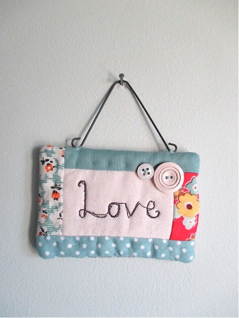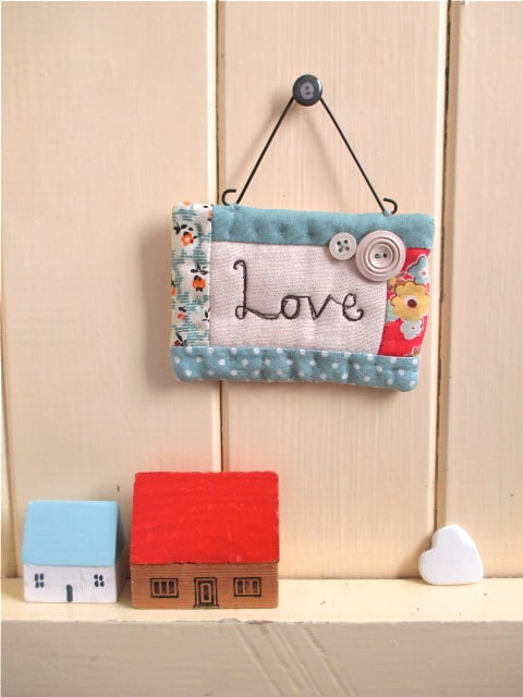 A Handmade hanging panel with the word 'Love' and vintage buttons decoration.