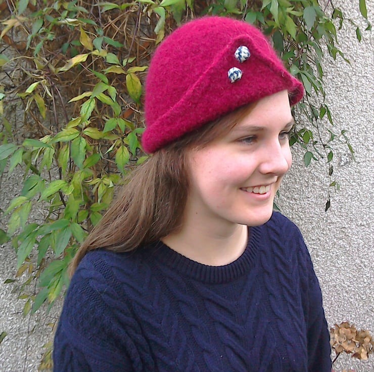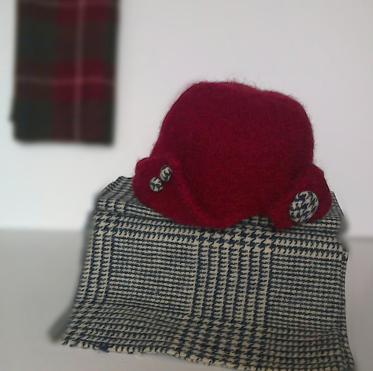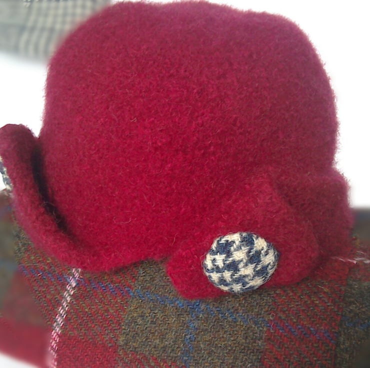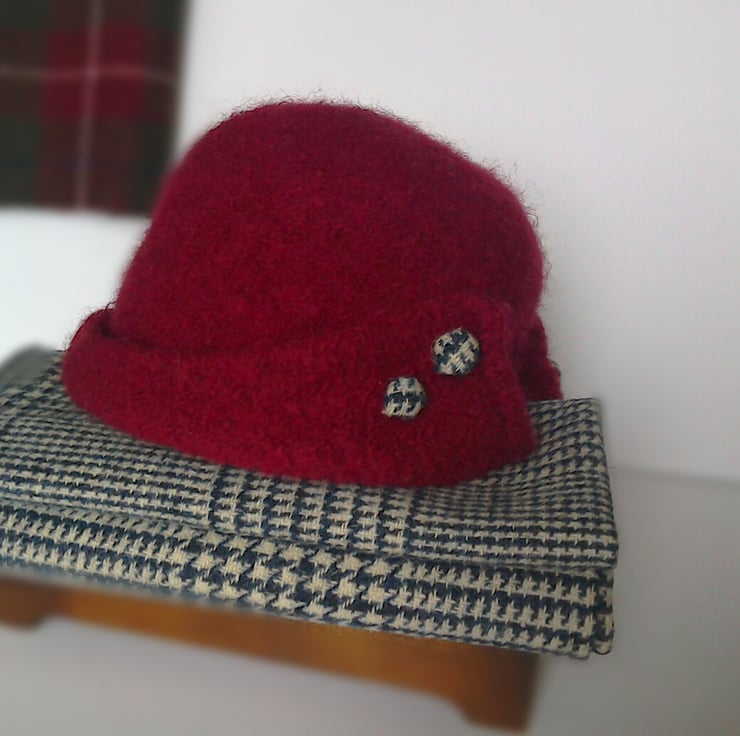 This warm red felted wool cloche hat with button trim is made from 100% wool with the buttons covered in Harris Tweed in a smart navy and cream Prince of Wales check.