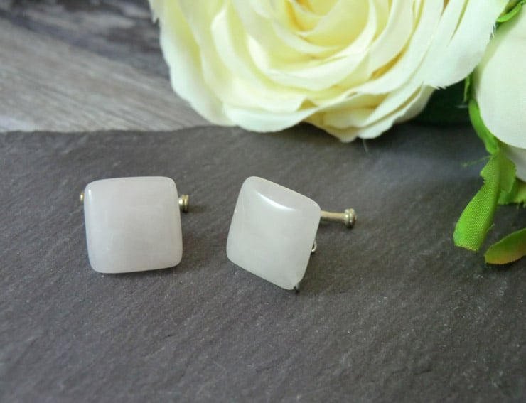 This is a stunning pair of rose quartz pink cufflinks. They are created using real rose quartz gemstones, and silver plated e-coated copper. The perfect accessory for everyday use or for that special event.