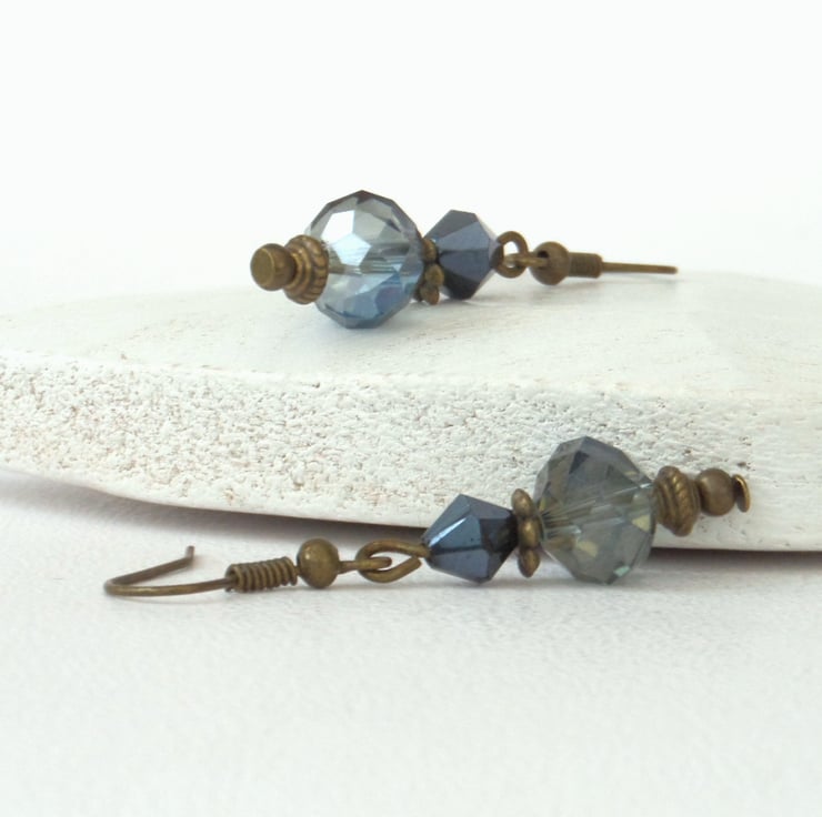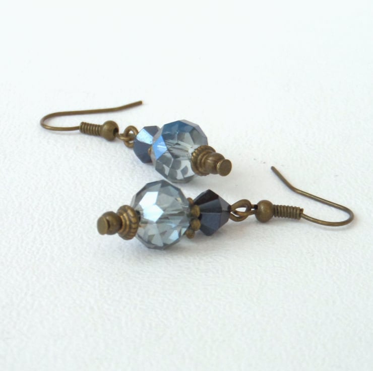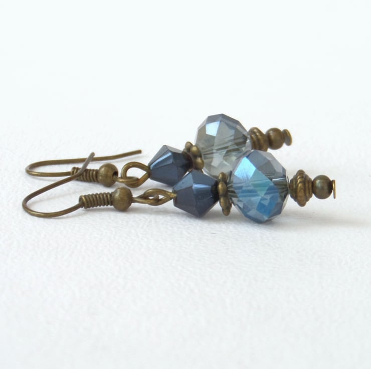 A delicate blue crystal rondelle hangs from bronze wires with a smaller jet coloured bicone shaped crystal.